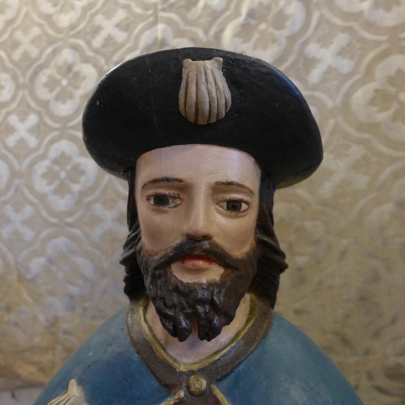 El santo, sereno, de pelo largo, mirada al frente y ojos grandes ovalados, se toca con sombrero de ala ancha con una venera en su parte central. Sostiene una larga vara a modo de báculo en su mano derecha, de la que se ha colgado una calabaza en funciones de cantimplora. Porta vestido largo, abotonado hasta abajo, manto y esclavina, en cuyos hombros se han tallado nuevas veneras. Con la mano izquierda se señala la herida del muslo en ese mismo costado.