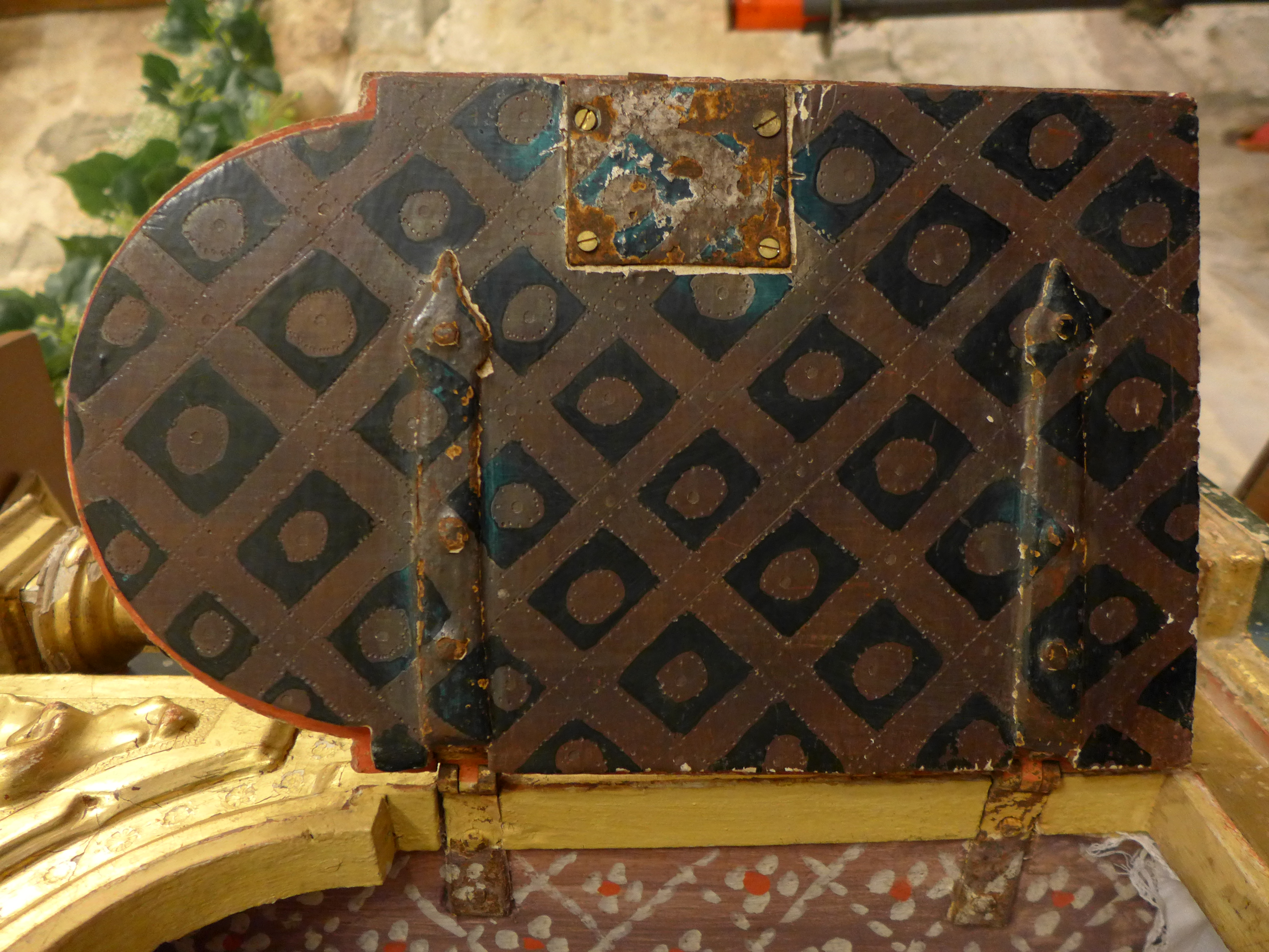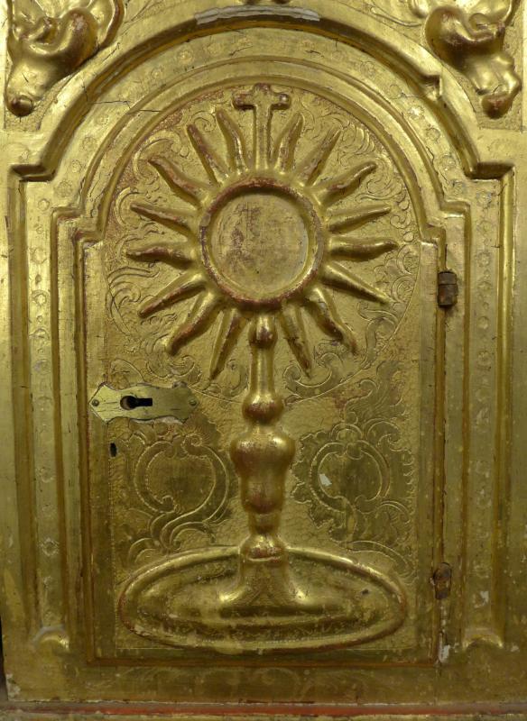 Portezuela moldurada en forma de medio punto, con un viril radiado en relieve. Dos golpes de talla decoran sus enjutas, y una cabeza de querubín reasalta en su parte central.