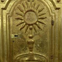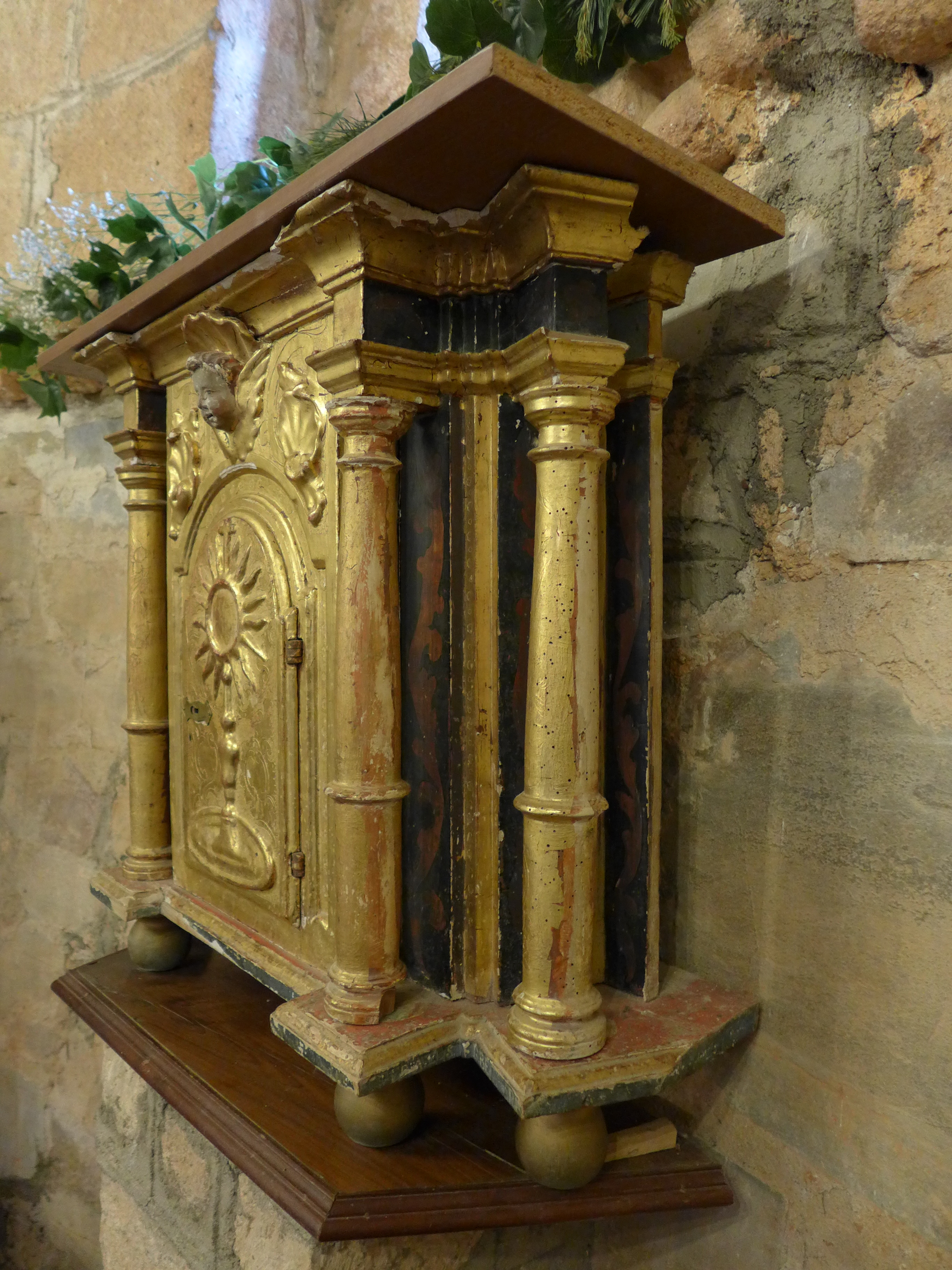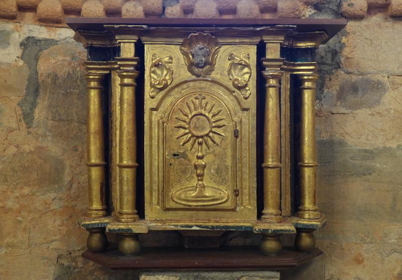 Tabernáculo actualmente aislado, por la venta del retablo al que perteneció. Muestra una parte central avanzada, donde se abre la puerta, y dos parejas de columnas, totalmente lisas, que sostienen un arquitrabe igualmente lisos, y marcan su tercio inferior y el espacio por debajo del capitel con sendas molduras simples, anillándolas. Destaca la ausencia de molduras y ornatos.