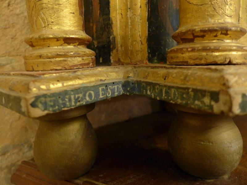 Carece de las tradicionales tallas apostólicas exentas que suelen acompañar este tipo de piezas en los laterales.