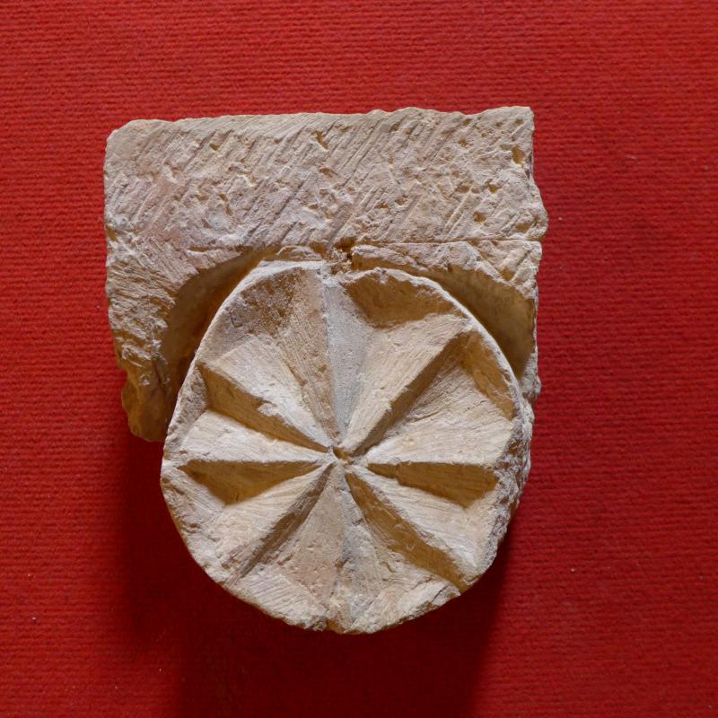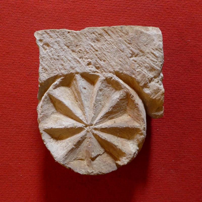 Canecillo, parcialmente mutilado, compuesto de un disco labrado por las dos caras. El interior del disco desarrolla líneas de sección triangular unidas en el centro. Nueve por un lado y ocho por otro.