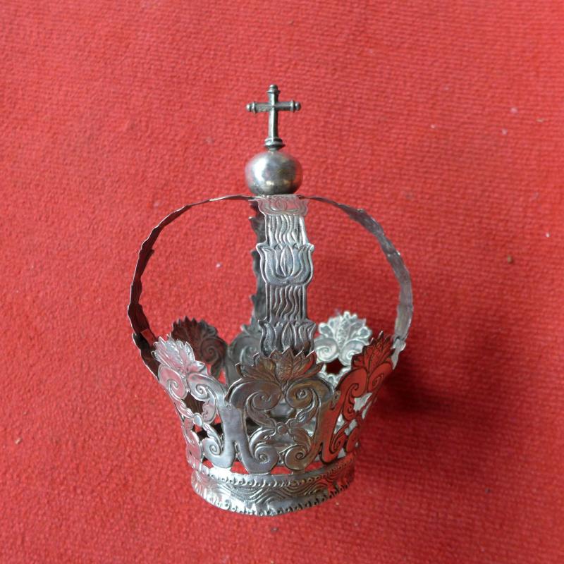 Sencilla corona real cerrada de lámina de plata compuesta de aro circular sin pestañas salientes decorado con ondas y puntos. Sobre él se dispone la cesta compuesta a base de "ces" afrontadas por su panzas y unidas por florones y rematada por una crestería de hojas y frutos similares a piñas. La corona se cierra mediante cuatro imperiales unidos su parte superior mediante bola y cruz terminal con brazos de perfil rombal. Cada uno de los imperiales va ornado con onda y tres resaltes a modo de cogollos vegetales.
