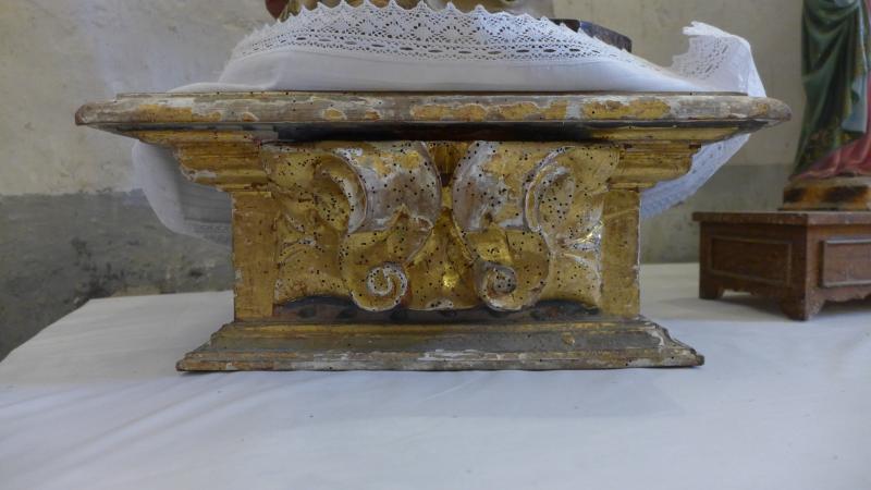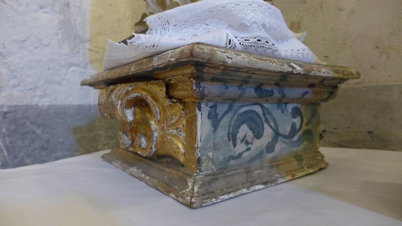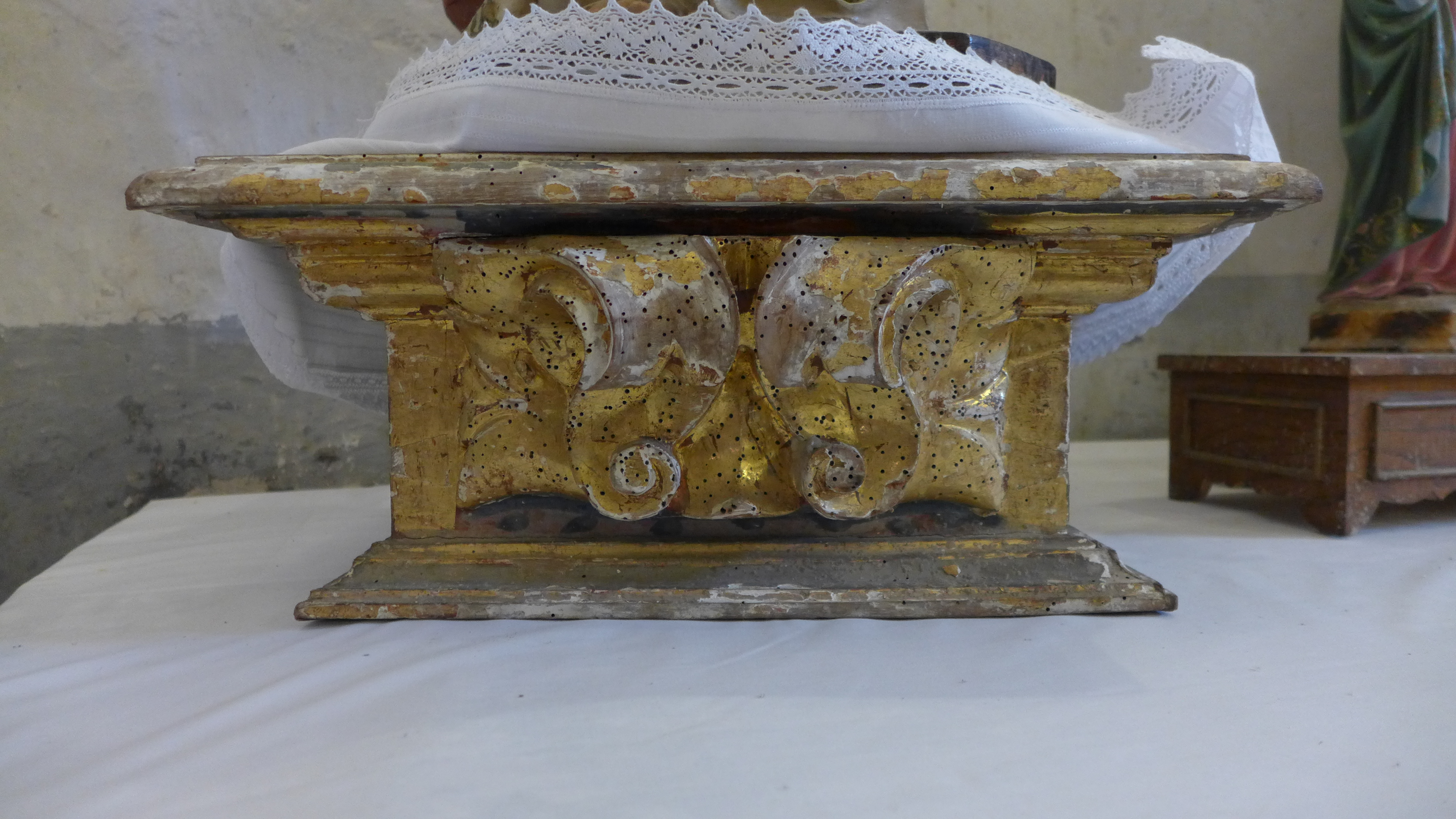 Peana prismática de planta rectangular, moldurada, con laterales pintados con motivos florales en colores azules, y frente dorado con decoración de volutas enfrentadas.