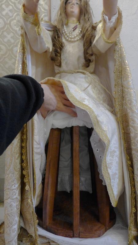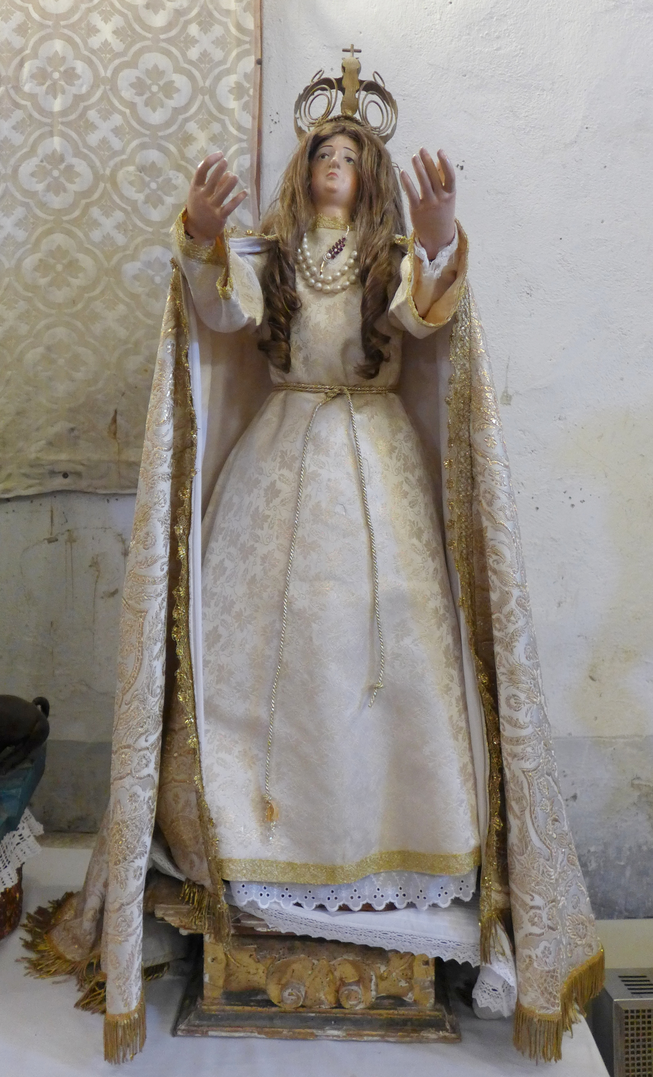 Virgen presentada de pie, con cabello natural de abundante volumen, y mirada elevada en actitud patética, reforzada por los brazos levantados y las desproporcionadas manos.