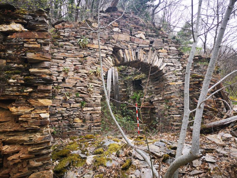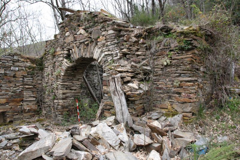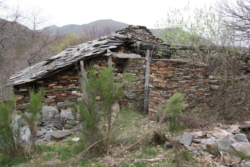 Conjunto de construcciones (seis) en proceso de ruina, realizadas en mampostería de esquisto. Se aprecian algunos trabajos recientes de consolidación y reparación.