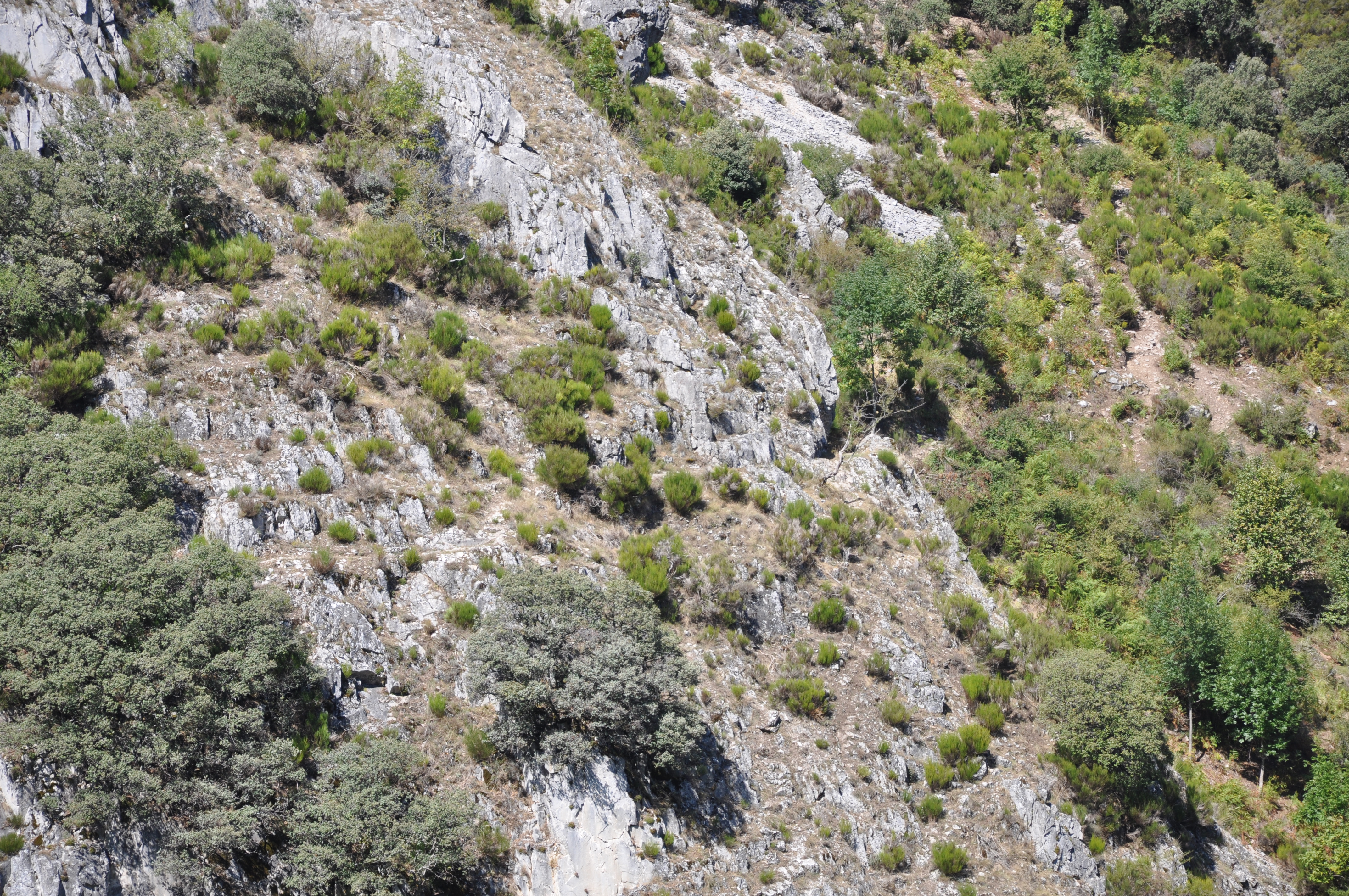 Tramo del canal CN-2 de Las Médulas tallado íntegramente en la roca caliza. El corte se sitúa en las inmediaciones de la Cueva de San Genadio, aguas abajo de esta.