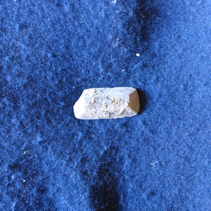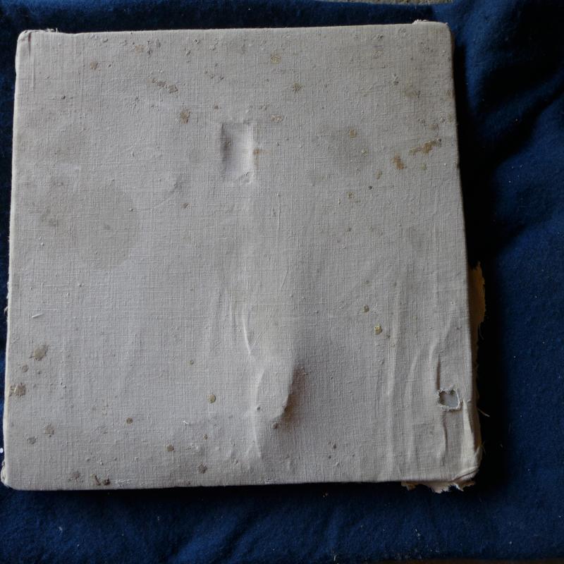 Pieza cuadrangular de mármol forrada con lienzo. Se aprecia la existencia de "sepulcro" al haberse desprendido y permanecer suelto dentro de su forro.