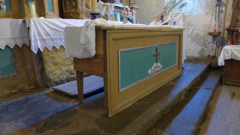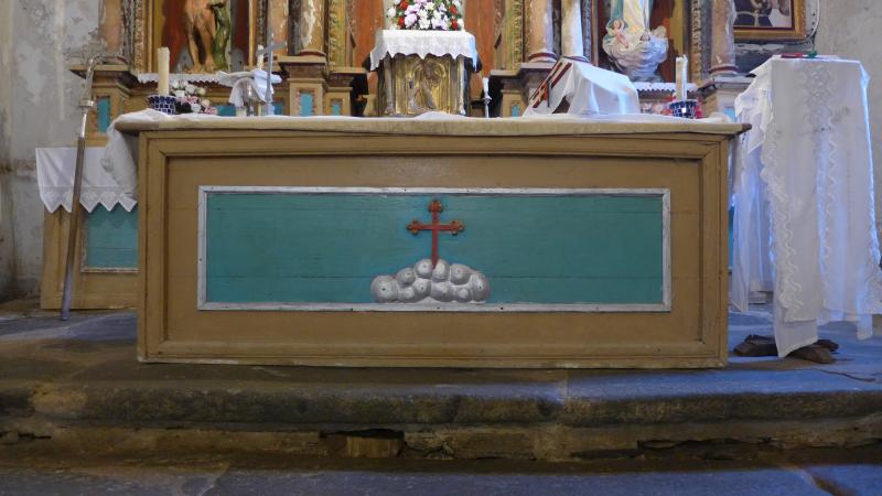 Frontal de moderna factura a juzgar por el trabajo de su carpintería, pese a que el basto repinte que luce impide precisar mucho más. Se rodea de un marco rectangular, parcialmente moldurado. Y en su casetón central exhibe una cruz remate trebolados asentada sobre un hipotético Calvario. Los tonos celestes y marrones casan con la policromía del retablo y también con la que ya se vio en los confesionarios.