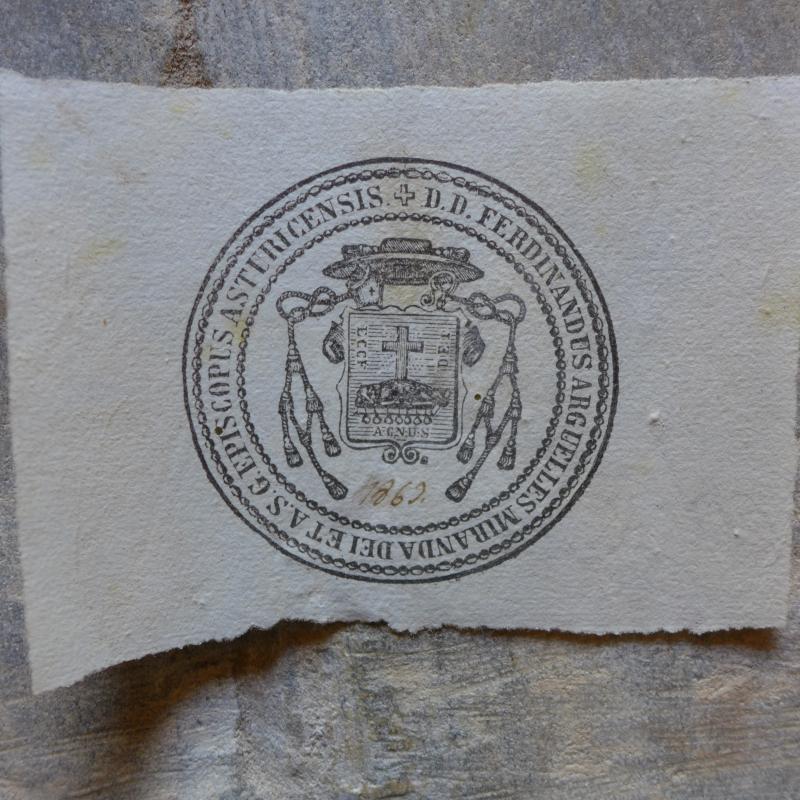 Lleva sello del obispado de Astorga en papel con la inscripción: "D. D. FERDINANDUS ARGUELLES MIRANDA DEI ET A. S. G. EPISCOPUS ASTURICENSIS" Y la fecha manuscrita de 1863
