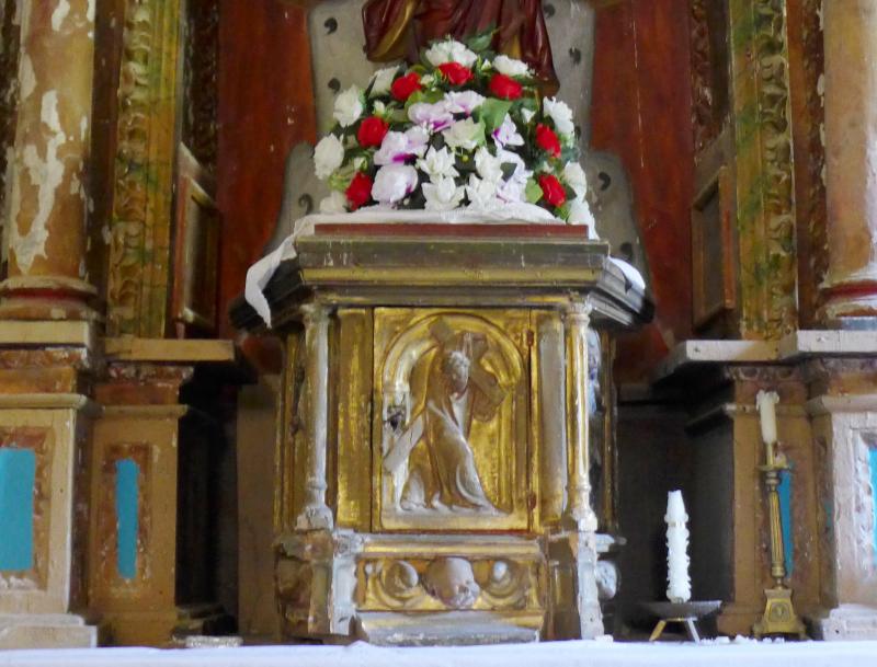 Todo él luce una policromía barroca que no le corresponde, inclusive en el interior que se doró y grabó en esa época a base de composiciones de rocallas, puesto que su ejecución no sería posterior a las últimas décadas del siglo XVI.