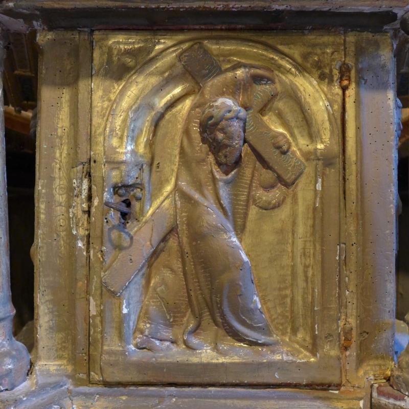 En la cara exterior de la puerta del tabernáculo se talló un Cristo camino del Calvario con la cruz a cuestas. Se muestra en posición de avance y sujetando la cruz de una forma bastante artificiosa, al modo de algunas composiciones de escultores de progenie juniana. Todo ello se enmarca en una arquitectura clásica, con arco de medio punto y pilastras cajeadas.