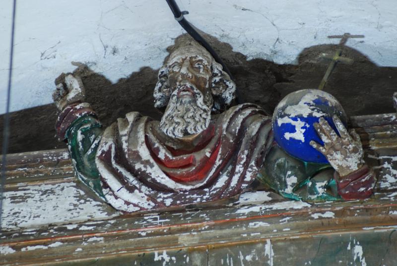Altorrelieve de Dios Padre que corona del retablo de Bouzas. Nos muestra al personaje de busto con los brazos extendidos y mientras con el derecho parece bendecir, con el izquierdo sujeta el orbe celeste. Viste túnica verdosa y manto que se enrolla alrededor del cuello formando una serie de pliegues concéntricos de discreto valor plástico. Su rostro anciano, va aderezado con larga barba y melena, ambos tallados con profusas ondulaciones. Sus facciones, de escasa definición resultan enjutas y bastante inexpresivas.