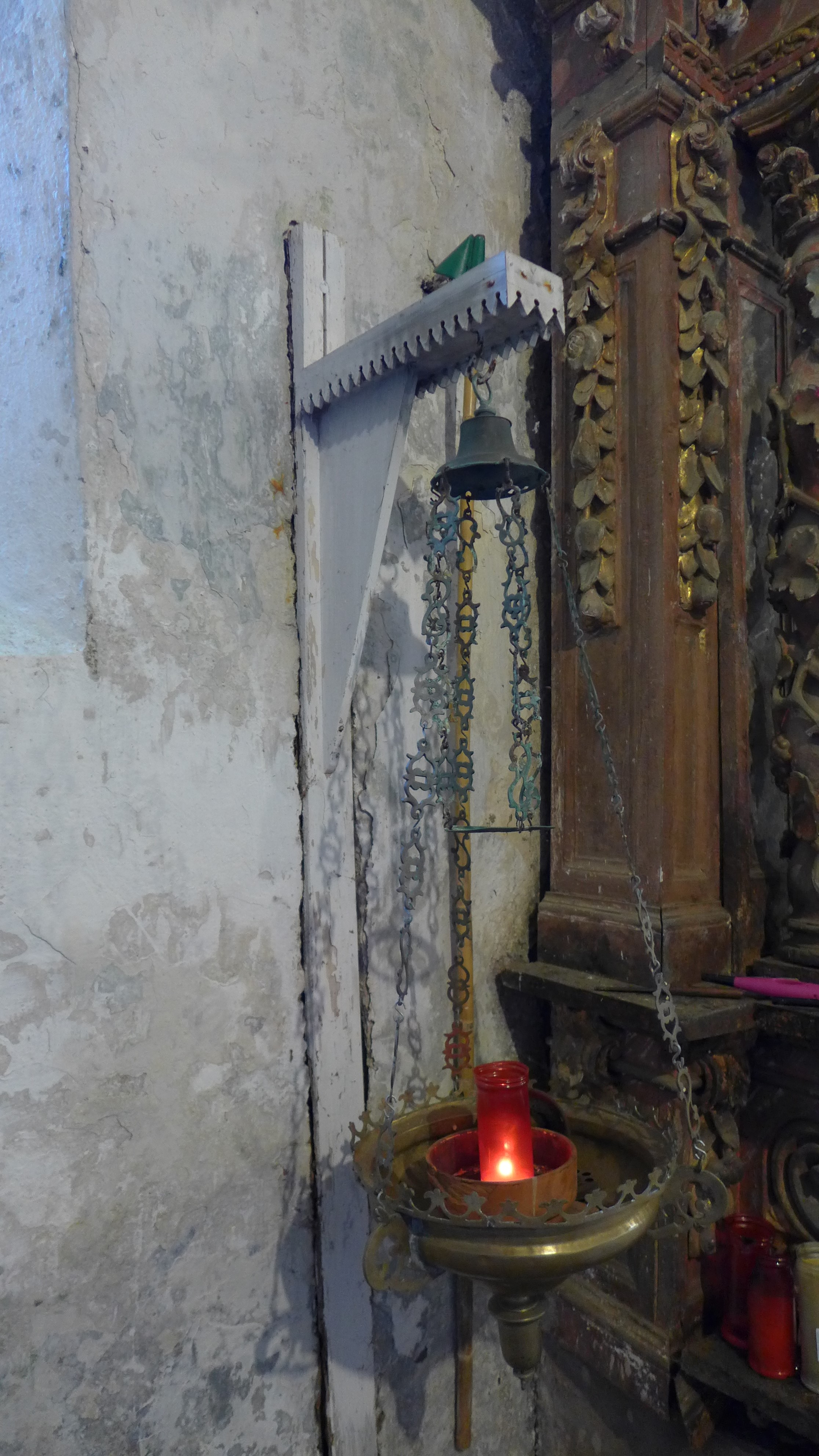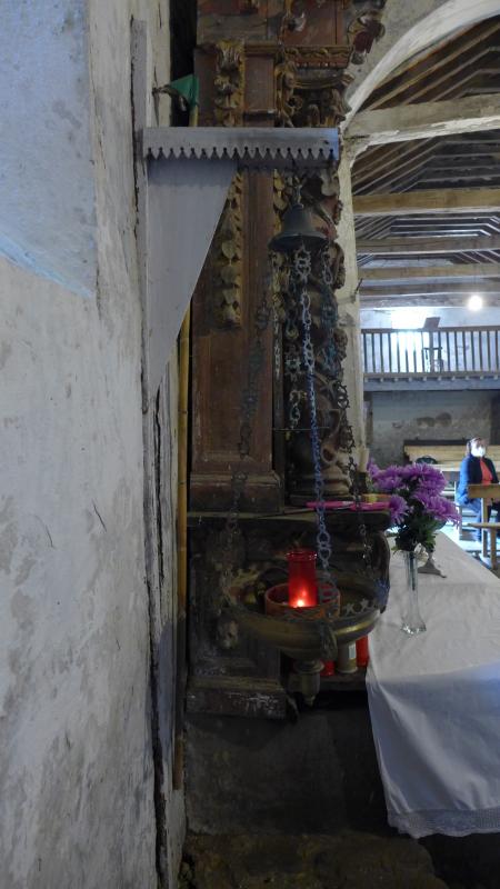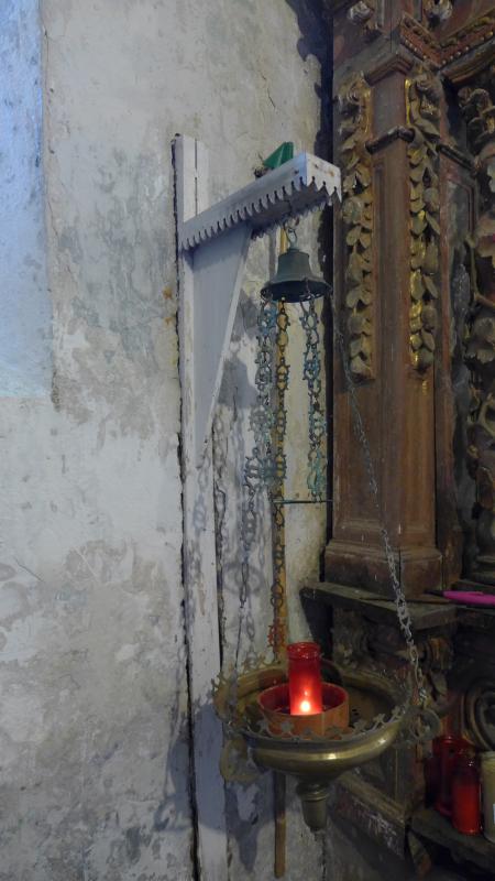 Esta lámpara presenta dos partes bien diferenciadas. La superior (que parece de cronología posterior), de forma campaniforme, por donde se cuelga del pescante, donde se encuentra la sujeción de la luminaria y de la que parten sus seis cadenas. La parte inferior (o vaso) tiene ancha boca, perfil abocelado con costillas fundidas y aplicadas, y remate periforme invertido. Ambas partes parecen de distinta cronología e incluso material.