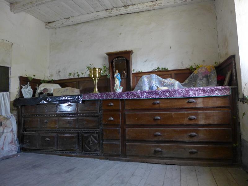 Mueble funcional compuesta de tres bloques de cajones. Los dos de los extremos, con cuatro y tres cajones, muestran frentes distintos lo que quizá se deba a alguna reparación o ampliación. El cuerpo central con otros cuatro cajones, pero de pequeño tamaño hermano con el bloque de la derecha. Por encima de la cajonería y fijado a la pared corre una una especie de frontalera lisa y con encasamientos rectangulares. A excepción del frente de los tres cajones distintos, que muestran ciertos golpes de talla y un cuarterón rombal el resto destaca por su sobriedad.