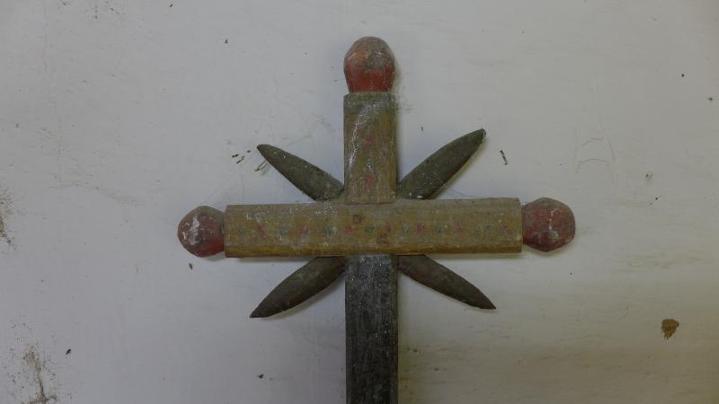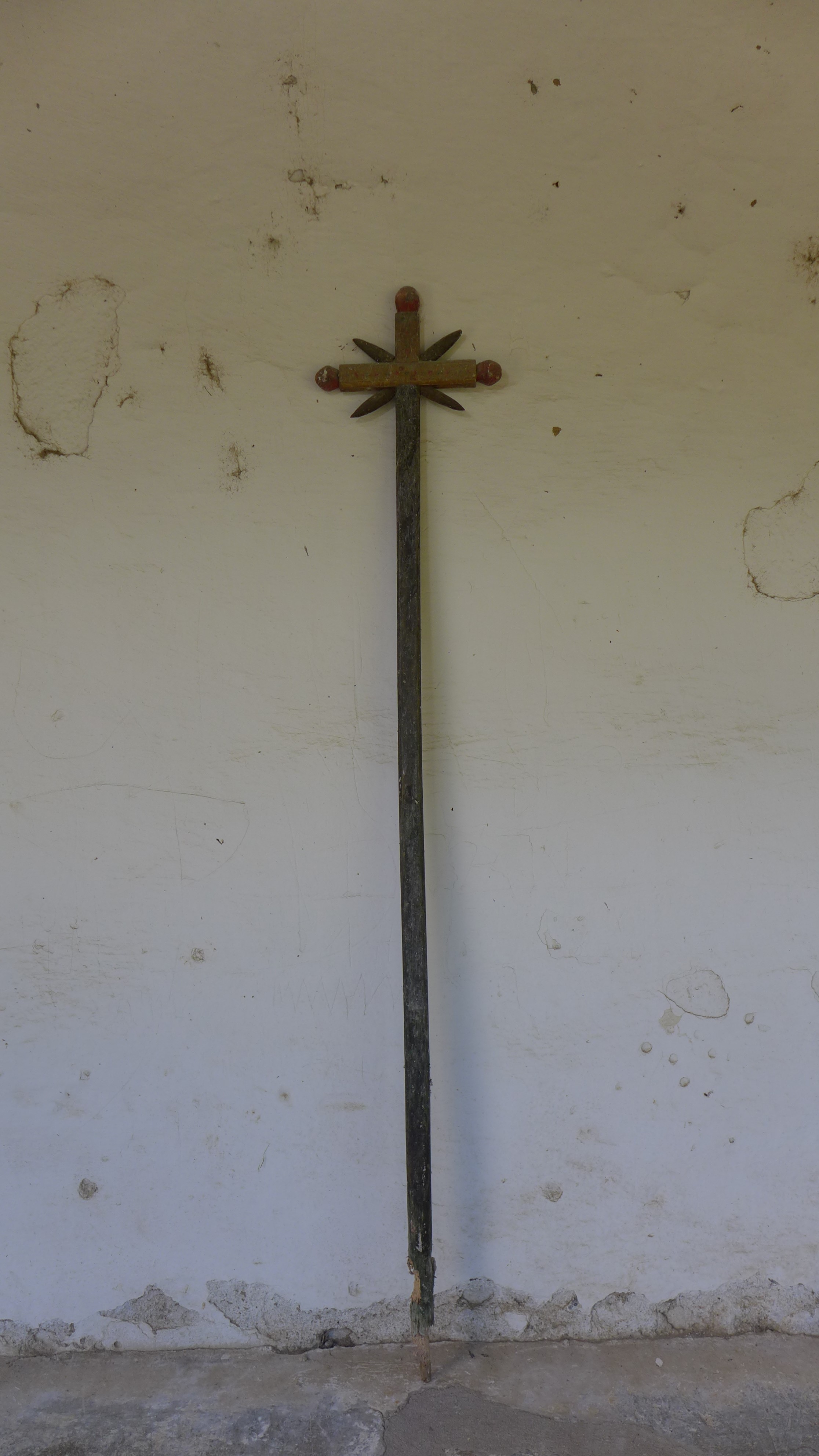 Cruz de largo vástago y brazos rematados en bolas. De sus ángulos centrales parten sencillos resplandores biselados. Muestra sencilla policromía de colores lisos.