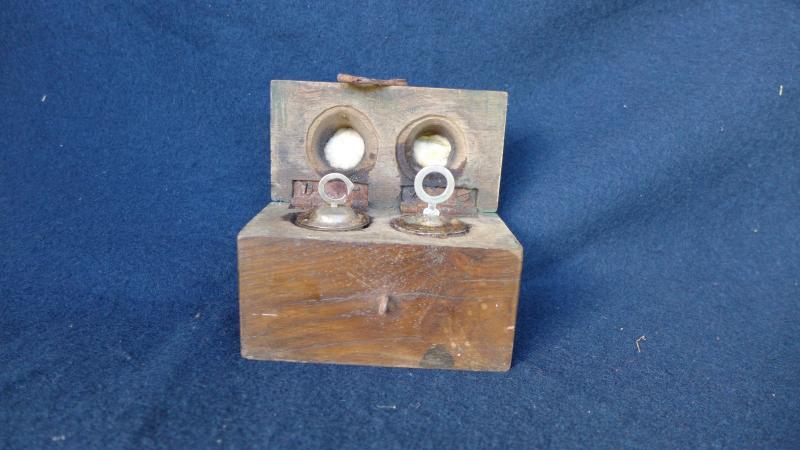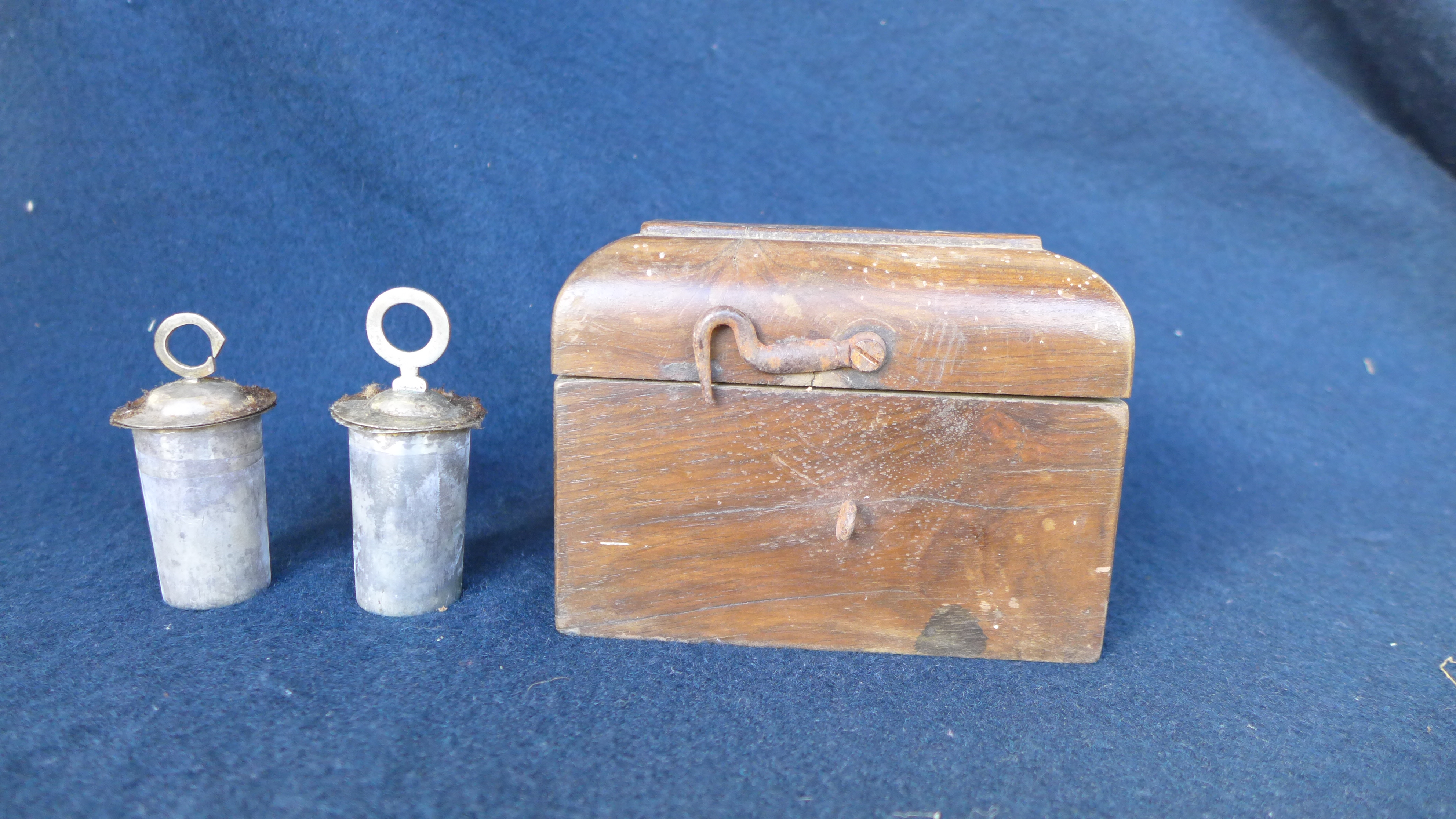 Cajita de madera maciza de base rectangular y tapadera de perfil abocelado. Ambas piezas van unidas mediante pequeñas bisagras de hierro, material del que también se hizo el pestillo de cierre. En su interior se horadaron dos agujeros cilindricos para insertar sendas olieras. Estas últimas son sencillas piezas de hojalata y van rematadas por tapaderas ligeramente abullonadas y tocadas por las letras C y O alusivas a su contenido.