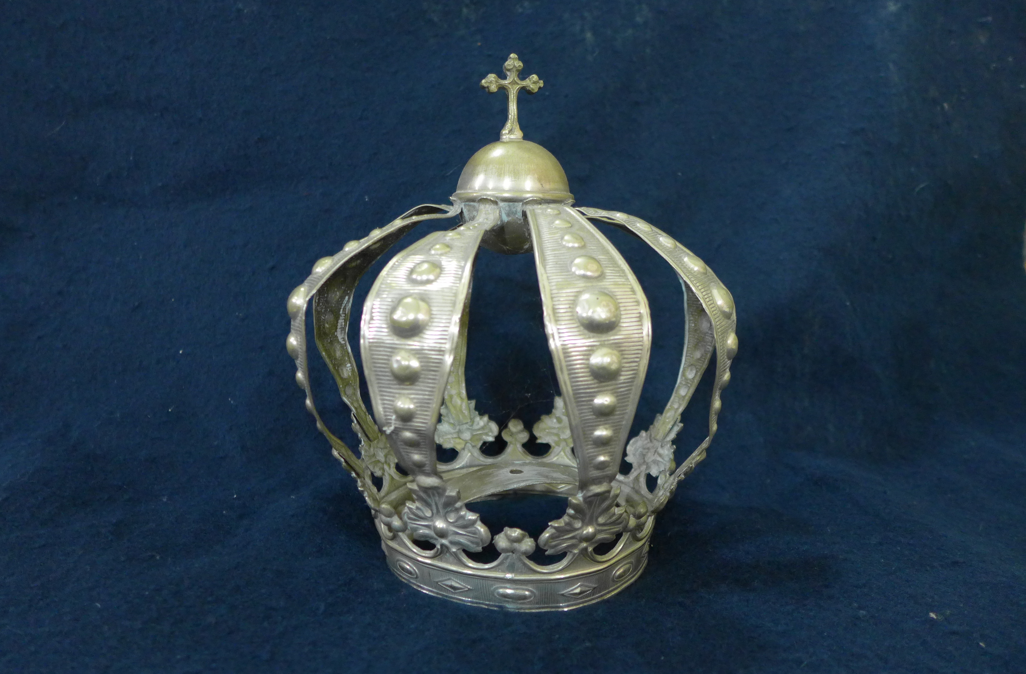 Corona real cerrada perteneciente a la Virgen del Rosario, de metal plateado. Se compone de aro, cuerpo bulboso de remate mixtilíneo y ocho imperiales con decoración abullonada que se unen mediante orbe y cruz terminal.