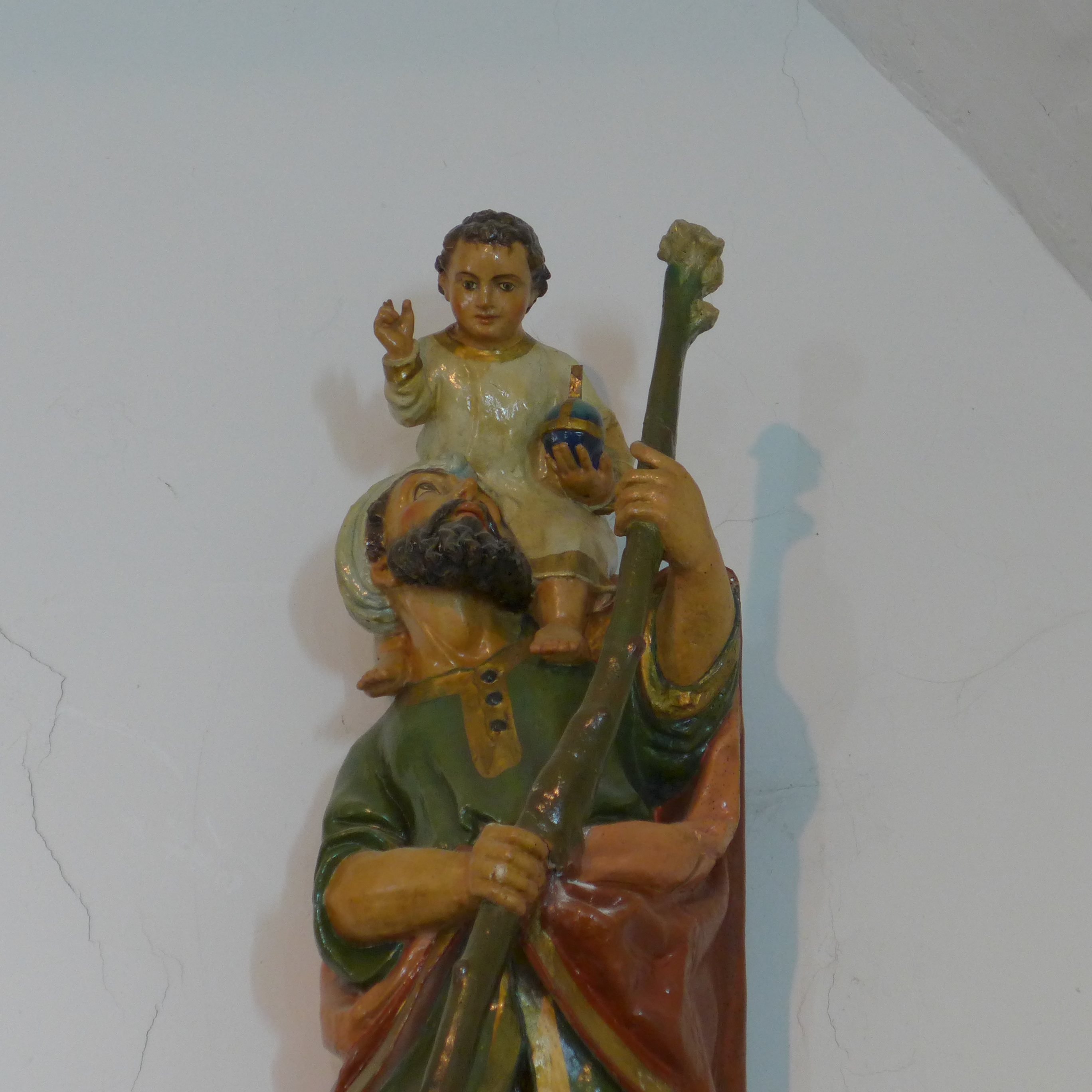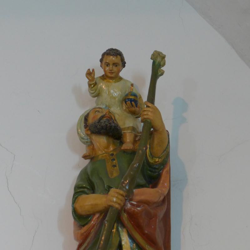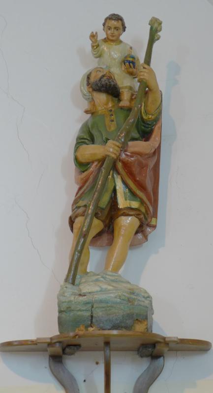 San Cristóbal, barbado, y que hunde sus pies en una alta peana que semeja el agua del río, se muestra de pie, con la mirada hacia el Niño al que asienta sobre su hombro izquierdo. El santo se apoya en un palo muy grueso que sostiene con ambas manos. Porta calzones remangados, vestigo verdoso y manto rojizo que descubre ambos hombros. Cubre su cabeza con un pañuelo.