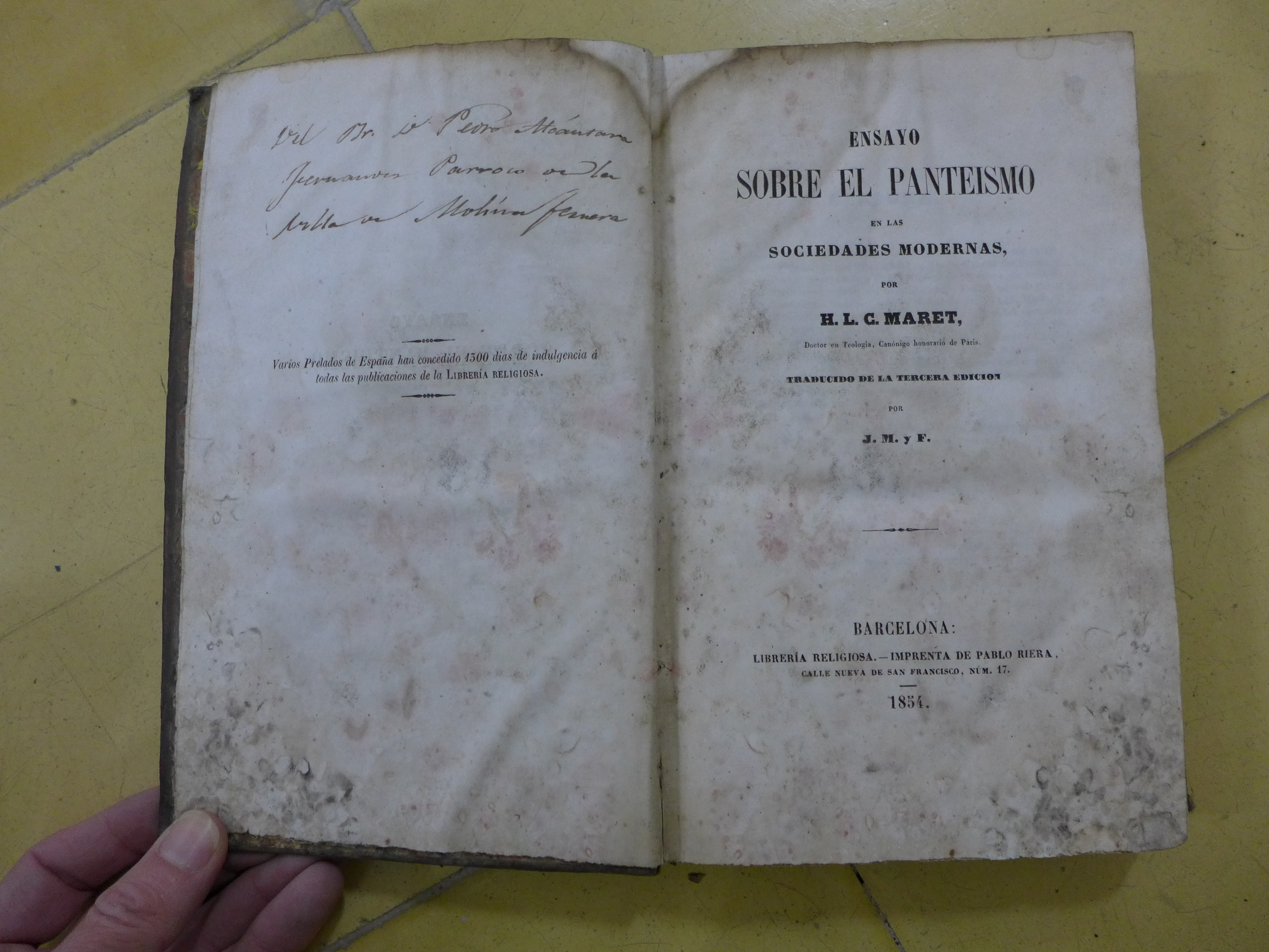 El exlibris manuscrito dice: del doctor don Pedro Alcántara, párroco de la villa de Molinaferrera, posiblemente el destino anterior de este párroco.