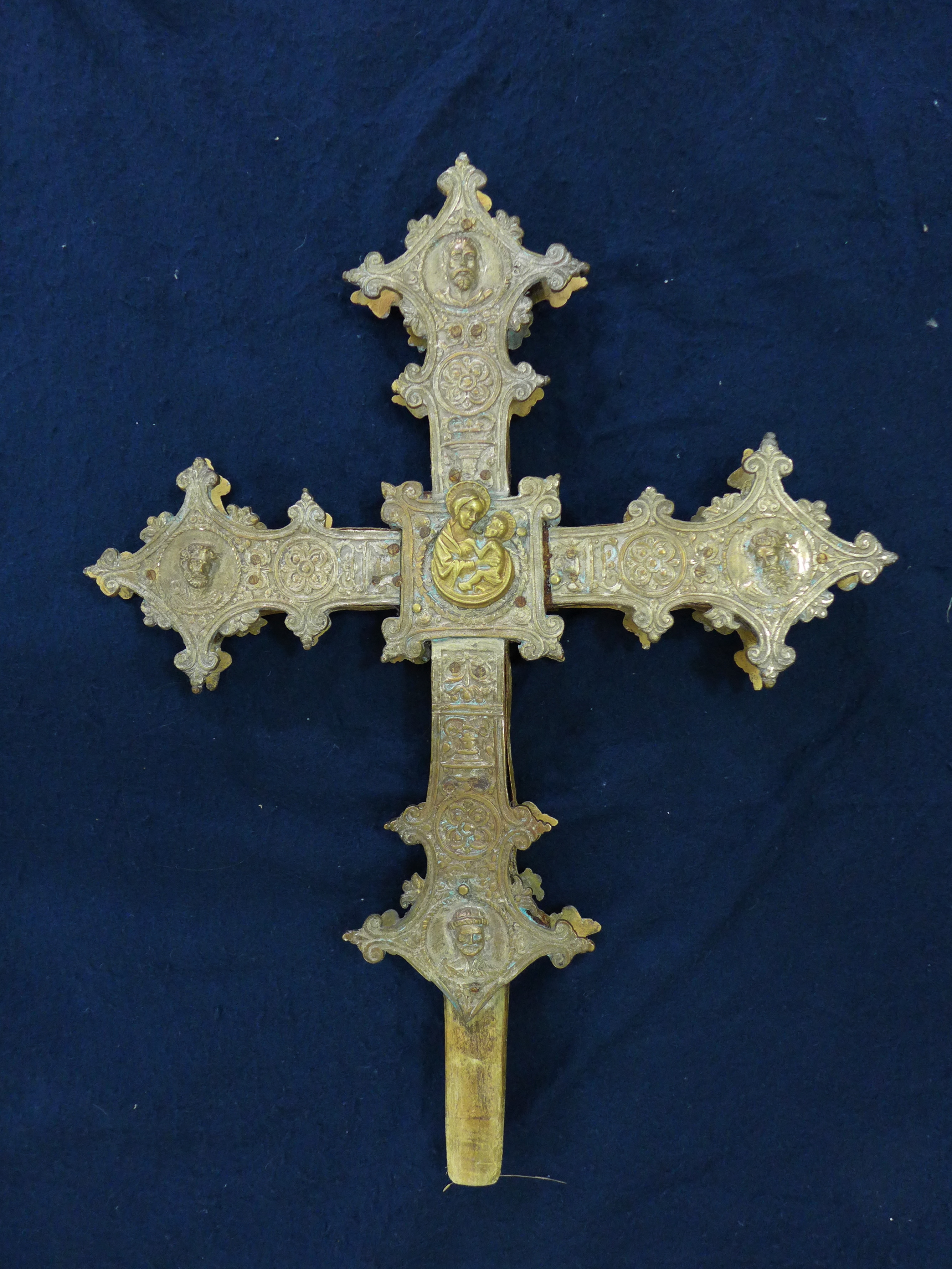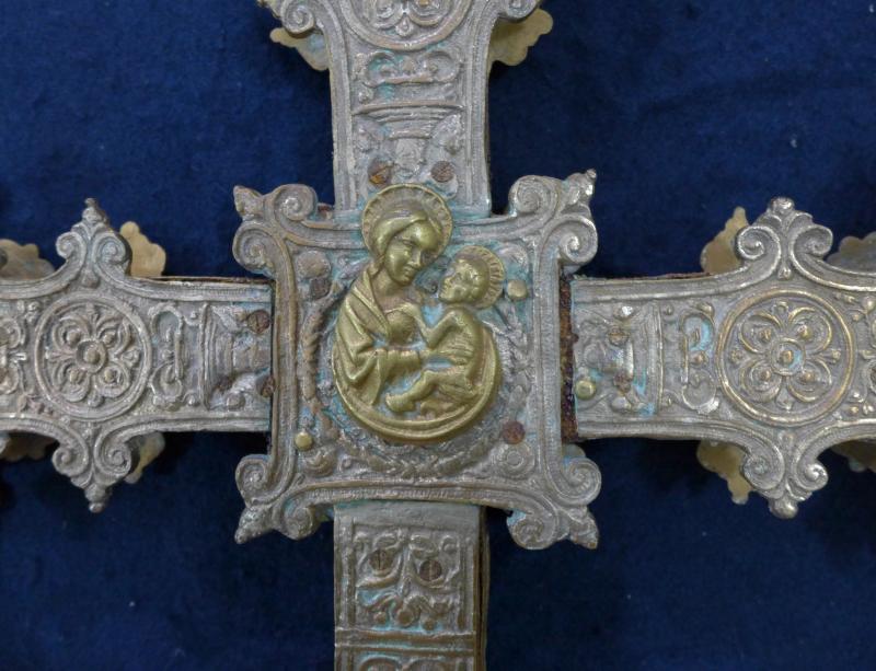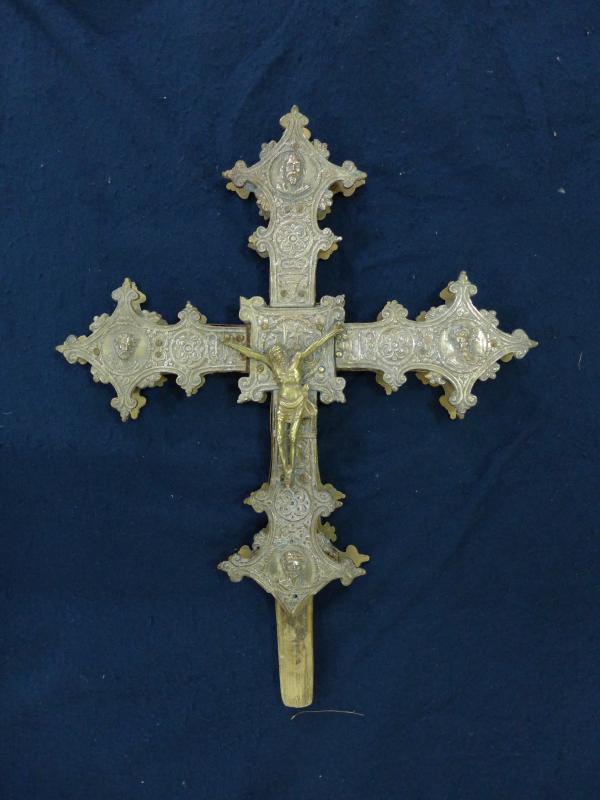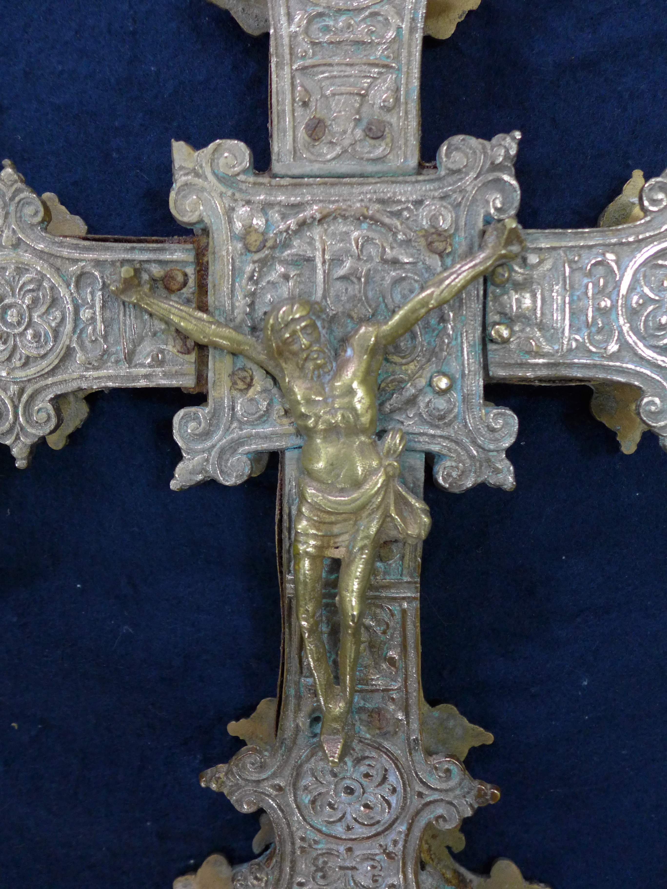 Repujado, en el cuadrón central del anverso, por debajo de la efigie en bulto del Crucificado, se lee el monograma IHS (Ihesus)