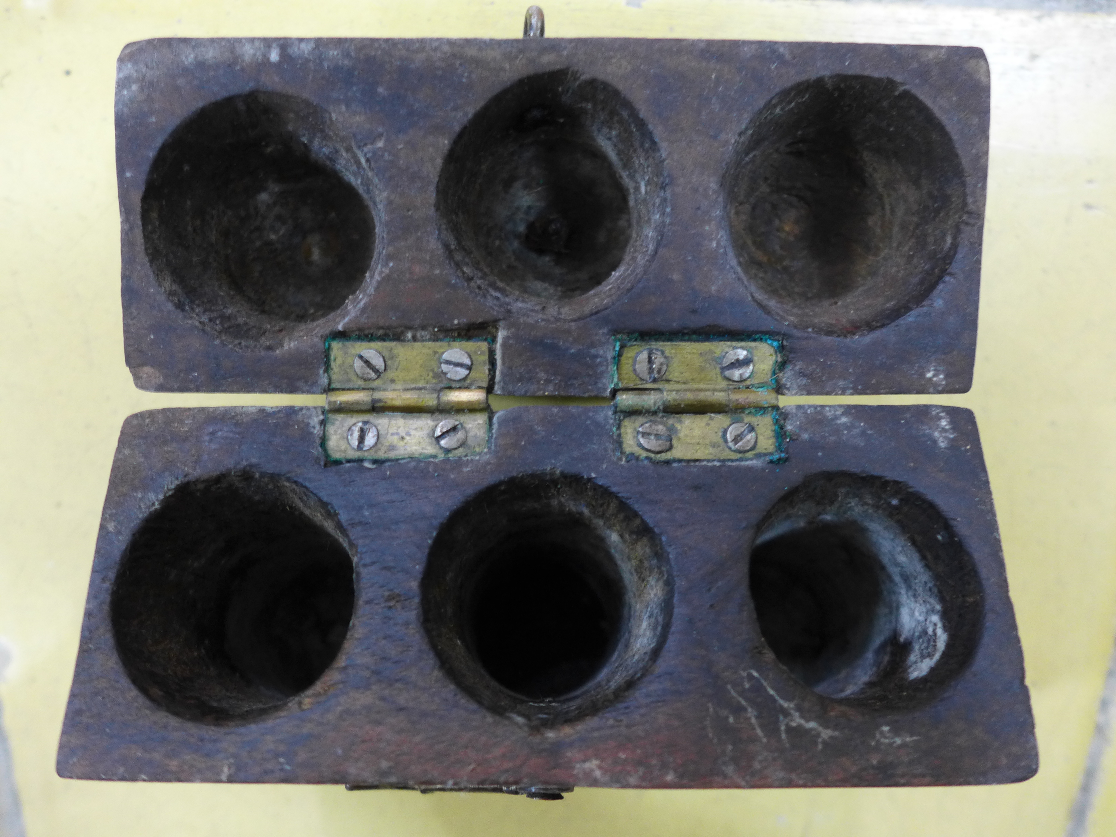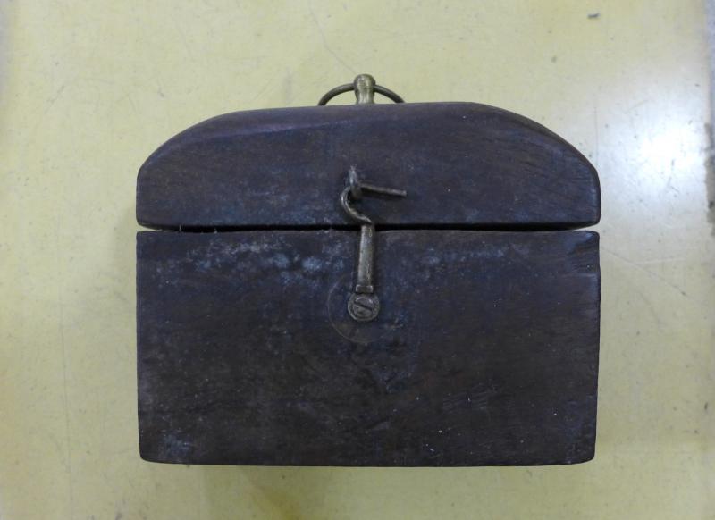 Caja rectangular, con tapa troncocónica de aristas suaves con tres orificios en su interior para guardar las olieras (que no se conservan).