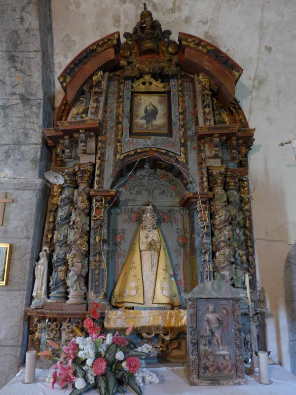 Interesante ejemplar de retablo barroco, a destacar entre todos los de las iglesias del valle del Oza y de la zona de Compludo. Destaca por su inusitada esbeltez, aunque el lenguaje redunda en el de la mayor parte de los retablos de la época. Posee un banco con ménsulas que soportan dos pares de columnas salomónicas y varias tarjas de motivos fitomorfos. Su cuerpo central, además de las columnas, lleva colgantes de frutos en los laterales y una hornacina de medio punto en el medio. La coronación, a modo de frontón curvo recoge pilastras y una zona rectangular en el medio que has sido modificada en época posterior. Mientras la hornacina central acoge una imagen de la Virgen, la caja superior alberga un cuadro moderno de una Asunción. Todo el conjunto muestra unos perfiles muy movidos, como desmuestran los entablamentos o la especie guardapolvo que sobresale del cierre superior del retablo. La advocación mariana del conjunto se refrenda por el motivo escultórico que remata la máquina, una corona real cerrada de imperiales fitomorfos.