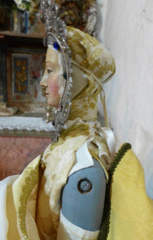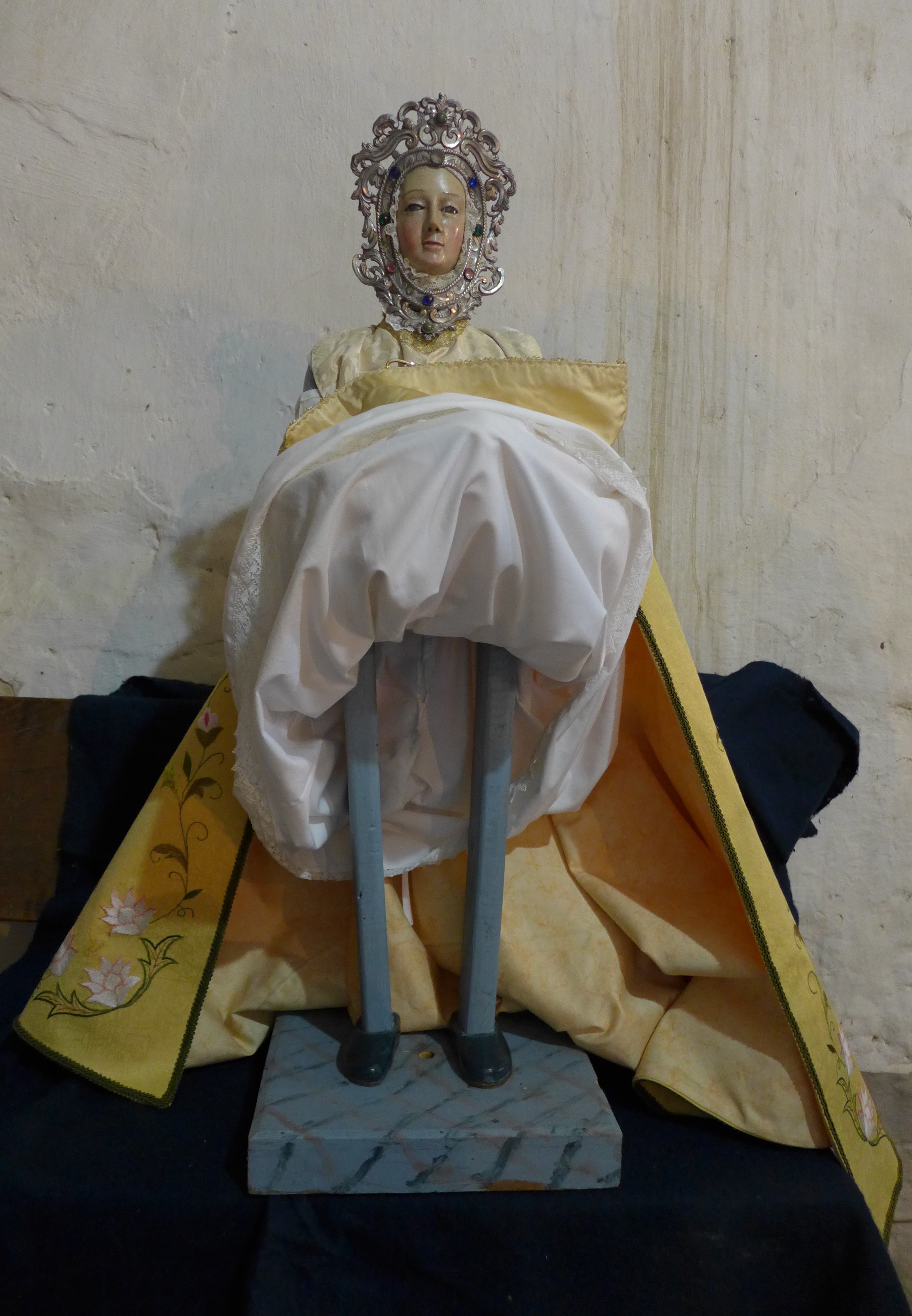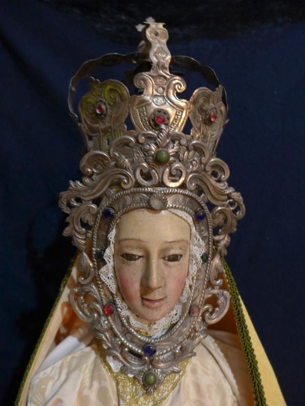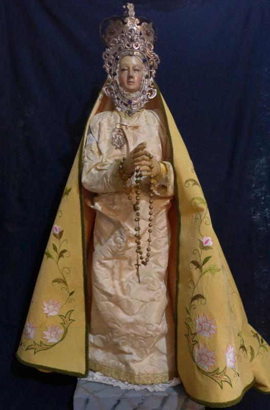 Imagen de vestir que, como la mayor parte de su género, mantiene de talla las manos, los pies y la cabeza; el resto es una estructura de maderas claveteadas lista para colocar diversos ropajes. Precisamente es este armazón el que nos habla de lo moderno de su hechura, aunque el rostro de la imagen no deja de tener cierta gracia y recordar a las de otras imágenes marianas de cronología barroca. A excepción de su corona y rostrillo, el resto del ajuar es de hechura bastante reciente.