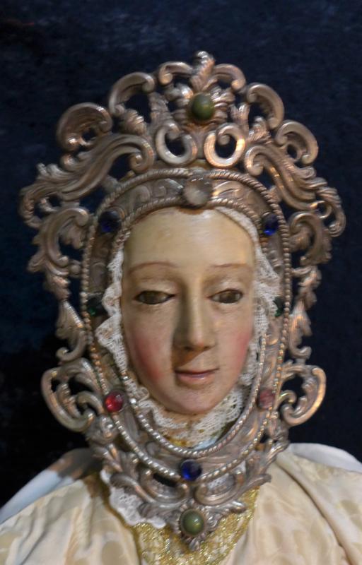 Algo más tardío que la corona es el rostrillo que exhibe la Virgen del Rosario. Su aro central, con dos hileras de sogueado, se articula a base de ces y tornapunta, con algunos engastes de pedrería. Y su orla exterior incorpora ces arriñonadas, motivos vegetales y unas incipientes rocallas. Es una pieza correctamente repujada y calada, de mejor hechura que la corona, quizá procedente de talleres cercanos como Astorga o León.
