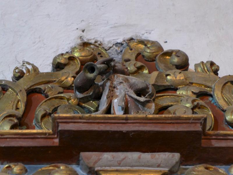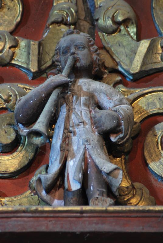 Imagen de ángel o niño que toca un aerófono similar a una cuerna o trompeta. Pese a lo maltrecho de su estado se le puede ver en pie y vestid o con una túnica blanca ceñida que se abre a la altura de las rodillas. Sus brazos resultan bastante desproporcionados, tanto que el que sujeta el instrumento como el que va hacia la cintura. Conserva cabellera larga y rizada