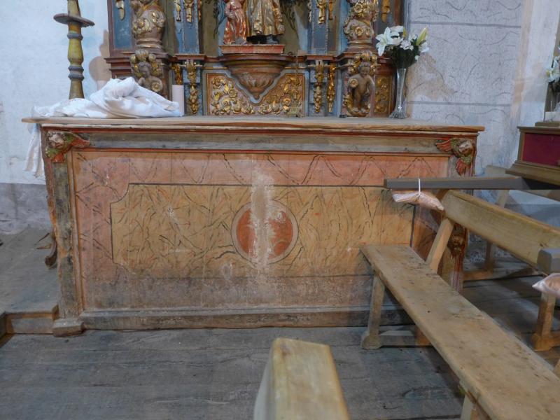 Añadido al retablo de San José está este frontal de altar que quizá se mandó hacer al tiempo que aquel. Es una pieza rectangular de borde moldurado y centro liso. En el marco encontramos tres cabezas de querubes de talla (faltaría la cuarta, para igualarse con el frontal del retablo frontero) y el resto del conjunto se orna con labores de jaspeado y algunos motivos geométricos entre los que destaca en motivo floral (parcialmente perdido) que campa en el centro del conjunto.