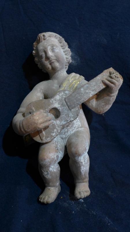 Escultura de bulto redondo de niño tañendo una guitarra. Va completamente desnudo si exceptuamos la tela dorada que cruza su cuerpo desde el hombro izquierdo hasta su cadera derecha. Muestra cabellera rizada y facciones regordetas. Antes o después de haber sido retirado de su retablo ha perdido parte del mástil de la guitarra y la mayor parte de su policromía