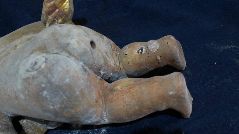 Le falta parte del mástil de la guitarra. En su reverso tiene un agujero para insertarlo en un vástago que aún se mantiene en el retablo