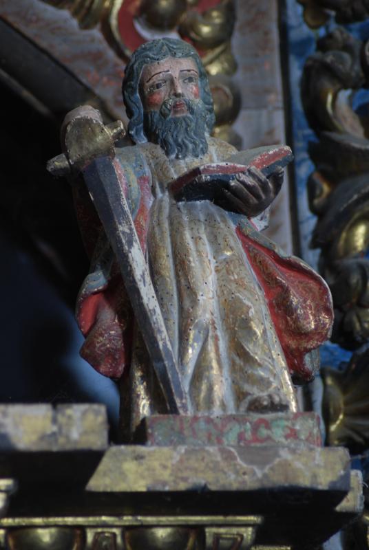 Pequeña escultura representando a San Pablo, identificado por la enorme espada que porta en su mano derecha y clava en la peana. Dispuesta sobre el tabernáculo y haciendo pareja con San Pedro, son tallas sencillas, verticales y resolución bastante sumaria, aunque con una cierta intención en el trabajo de los paños. El santo muestra semblante serio, larga cabellera y barba de mechones ondulantes. En su mano izquierda porta, además, un libro abierto. Su policromía aún se realizó a base de sencillos estofados y profusión de dorados. Por sus facciones se asemeja bastante a la figura del Dios Padre