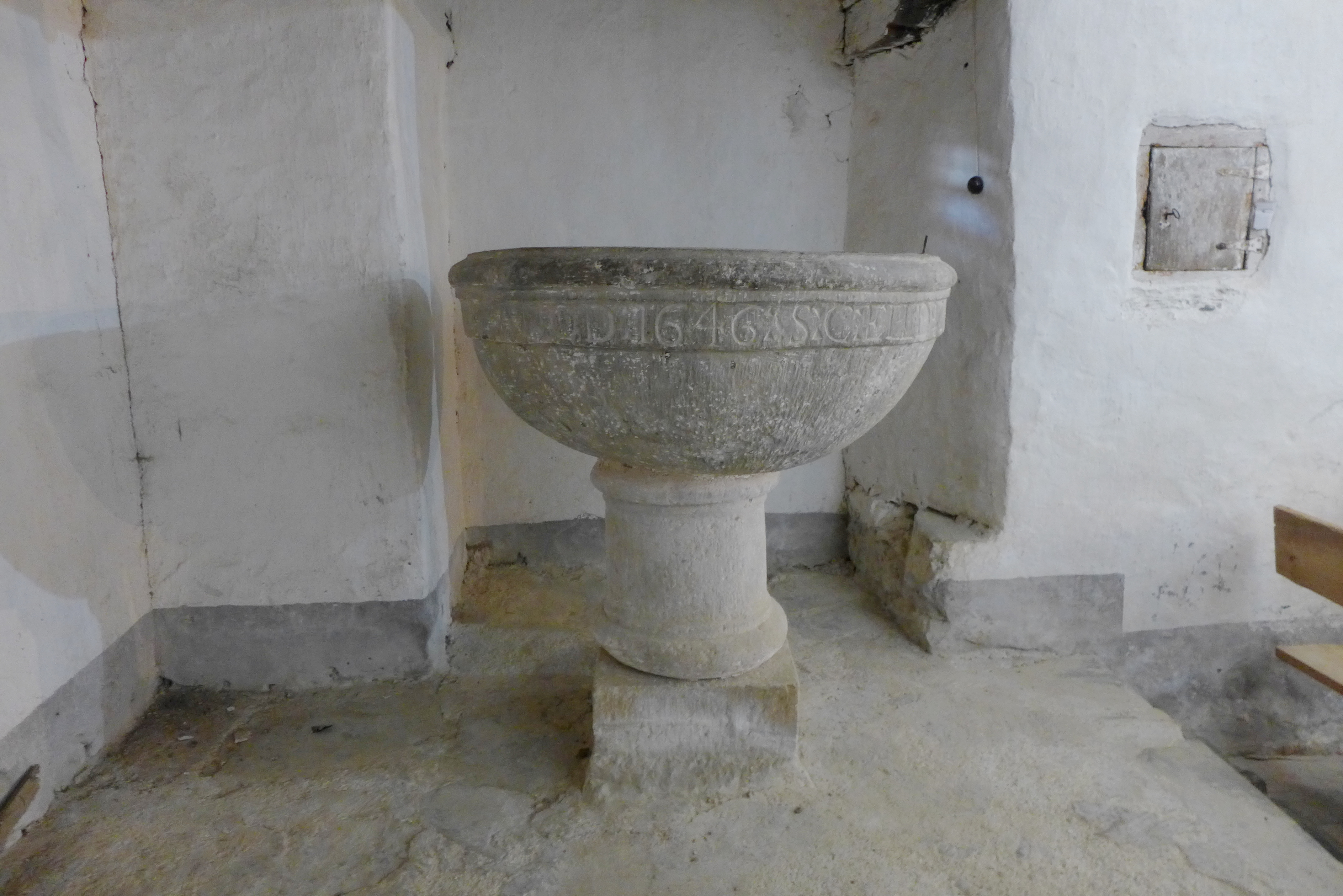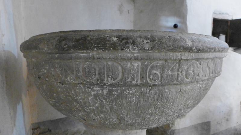 Contiene una inscripción perimetrla en su copa, en letras mayúsculas, que reza: S[iendo] C[ura] EL L[icencia]DO GRMO GOMEZ AÑO DE 1646