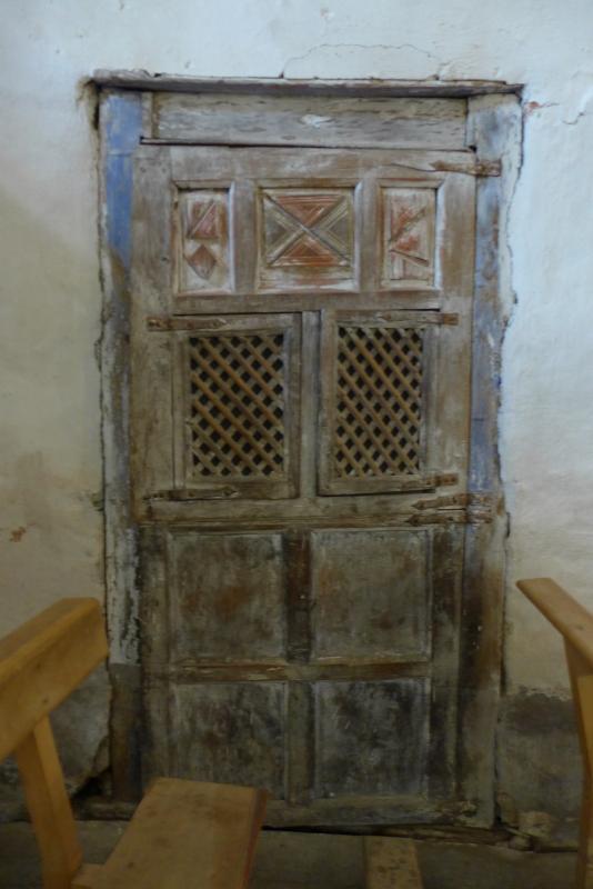 Puerta entre tosco jambaje que abre a un confesonario encastrado en el muro.
