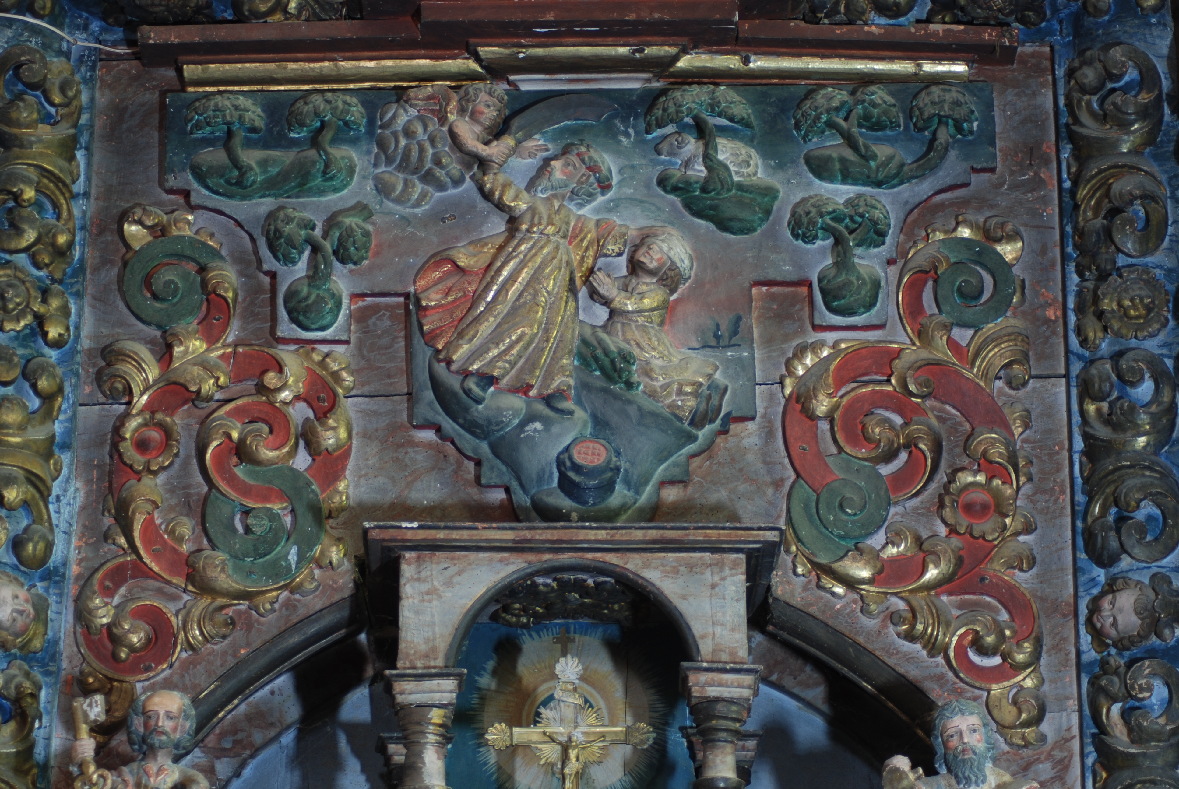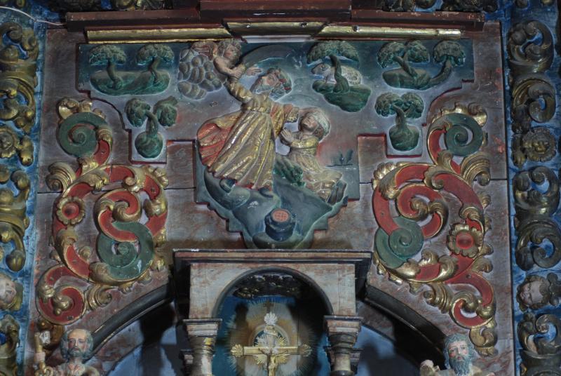 Bajorrelieve que acomoda su representación al retablo bíblico, acogiendo el momento en que el patriarca Abraham está a punto de sacrificar a su hijo Isaac. El primero levanta su brazo asiendo un largo cuchillo de hoja curva, mientras el infante se coloca de rodillas, con las manos en oración y los ojos tapados con una cinta de tela. A ambos les acompaña el ángel del Señor, que detiene a tiempo el acto del martirio. En su lugar se entregará un cordero tallado a la derecha de la escena, cobijado por un árbol. Alrededor se muestran una serie de árboles de pequeño tamaño y copa frondosa. La acción adolece de cierto dinamismo, pese al movimiento del manto de Abraham o del giro de su cabeza hacia el ángel.