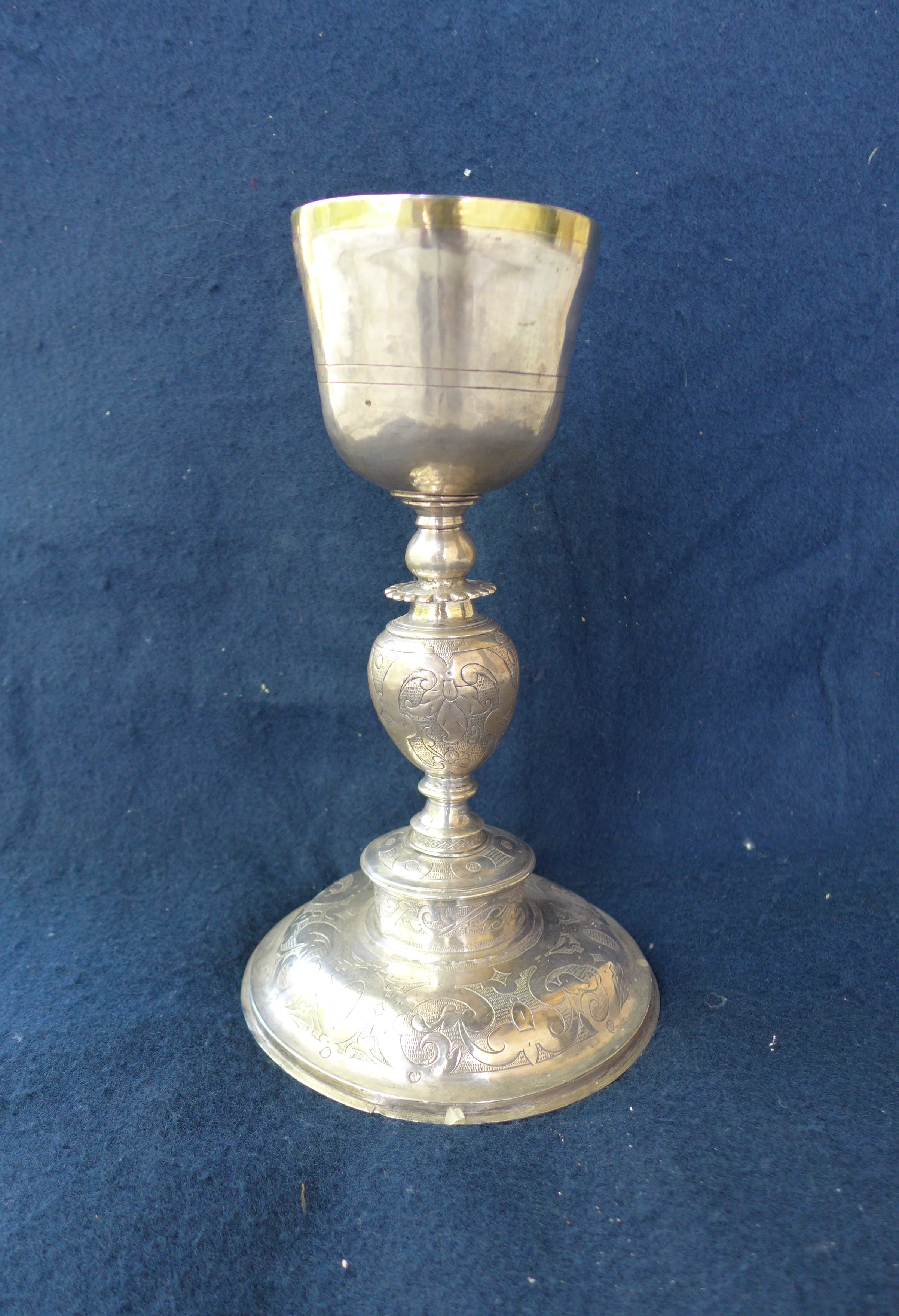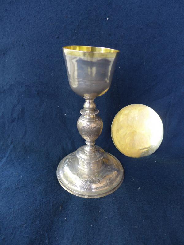 Posee base de forma convexa, perfil abocelado y pestaña saliente lisa. El astil es complejo, manteniendo aún ciertos modelos del siglo XVI, con gollete cilíndrico, nudo ovoidal y varios cuellos cóncavo convexos y alguna arandela de borde lobulado flanqueándolos arriba y abajo. La copa, de forma troncocónica, marca su rosa mediante una doble línea incisa. Todo él es de plata en su color, a excepción de los labios, que van dorados. Basa y astil lleva decoración grabada de cintas, ces y algún motivo de carácter fitomorfo y fondo picado de lustre.