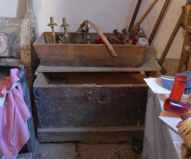 Caja de estructura prismática rectangular constituida por cuatro paneles verticales enterizos, ensamblados a cola de milano. La cubierta es plana, y ha perdido uno de los dos tablones de que se formaba. Los pies se forman con cuatro maderas de sencillo perfil mixtilíneo.