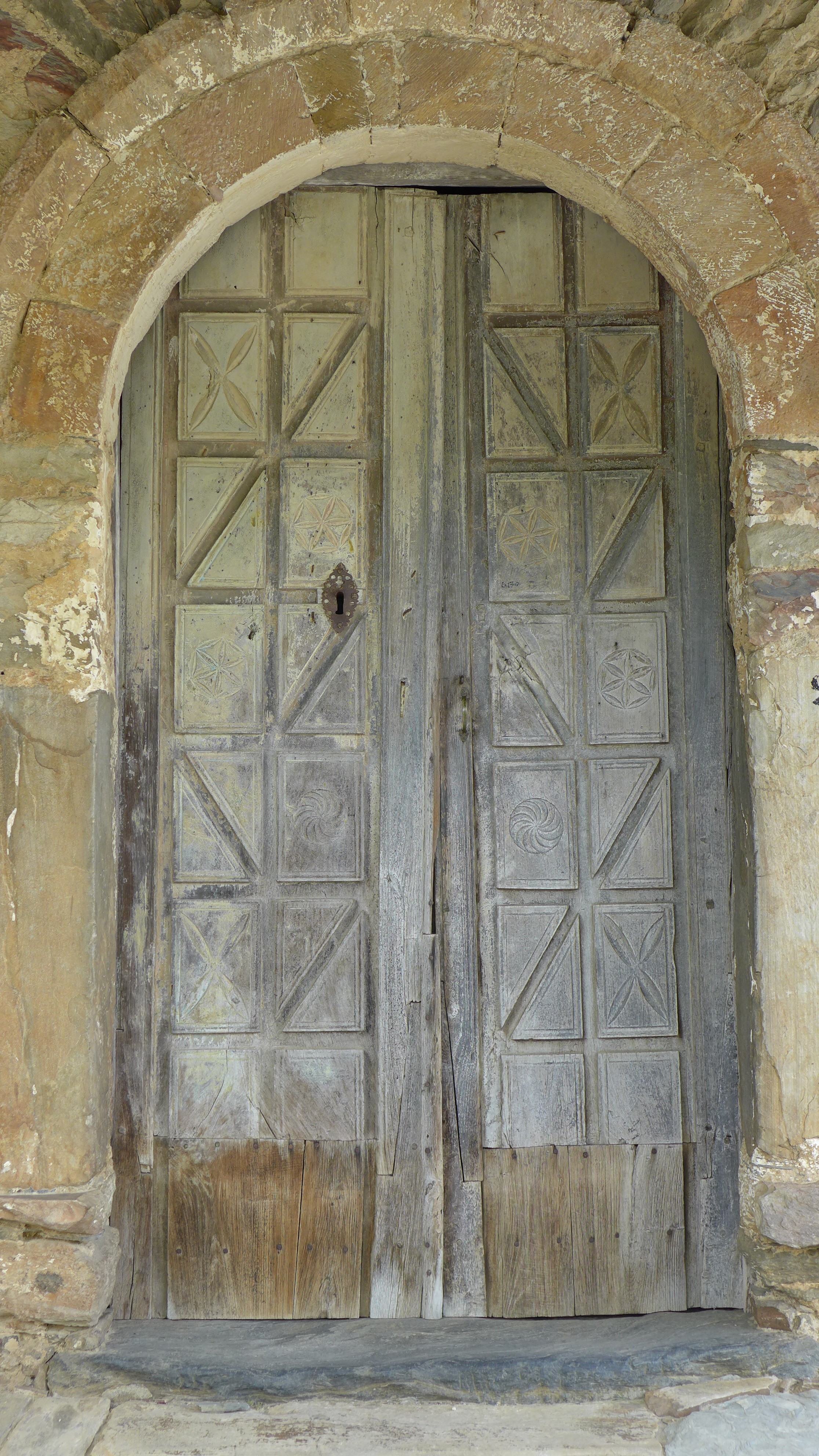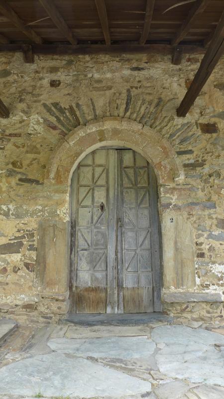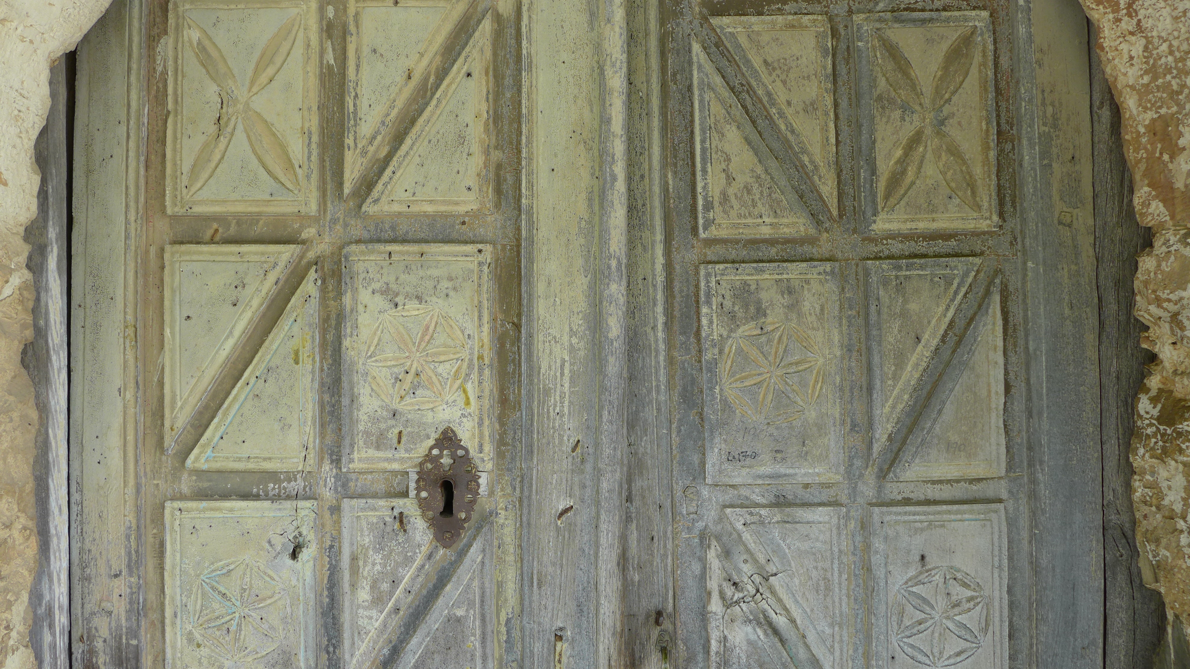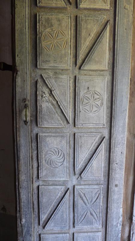 Puerta de dos hojas configurada a base de cuarterones rectangulares dispuesto en dos bandas alargadas enmarcadas por sendos carriles lisos. Estos cuarterones alternan decoración y mientras unos van partidos en diagonal, otros tallaron en su centro rosetas, discos solares y cuadripétalas. La parte inferior ha sido repuesta y conserva su bocallave original en su hoja derecha. Parece que siempre tuvo algún tipo de policromía grisácea, que hoy se encuentra parcialmente perdida.