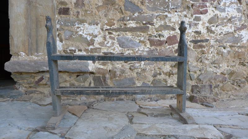 Simple estructura compuesta de dos listones de madera ensamblados a dos montantes, con remate superior moldurado y pies rectos. El tablero superior se perfora con seis agujeros para colocar las respectivas hachas.