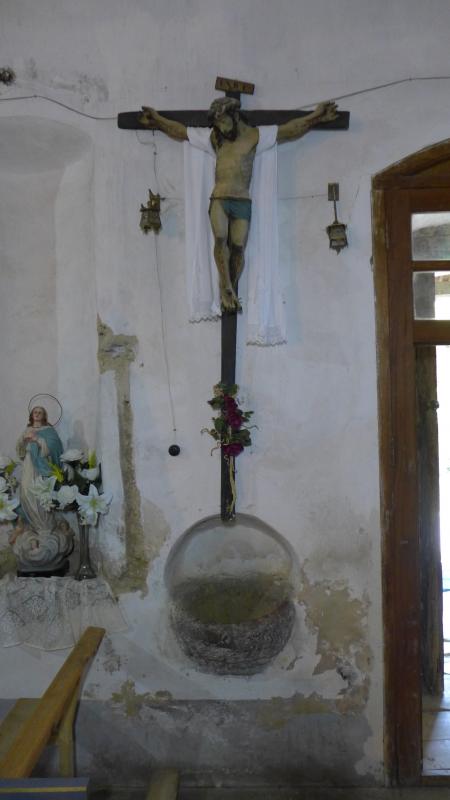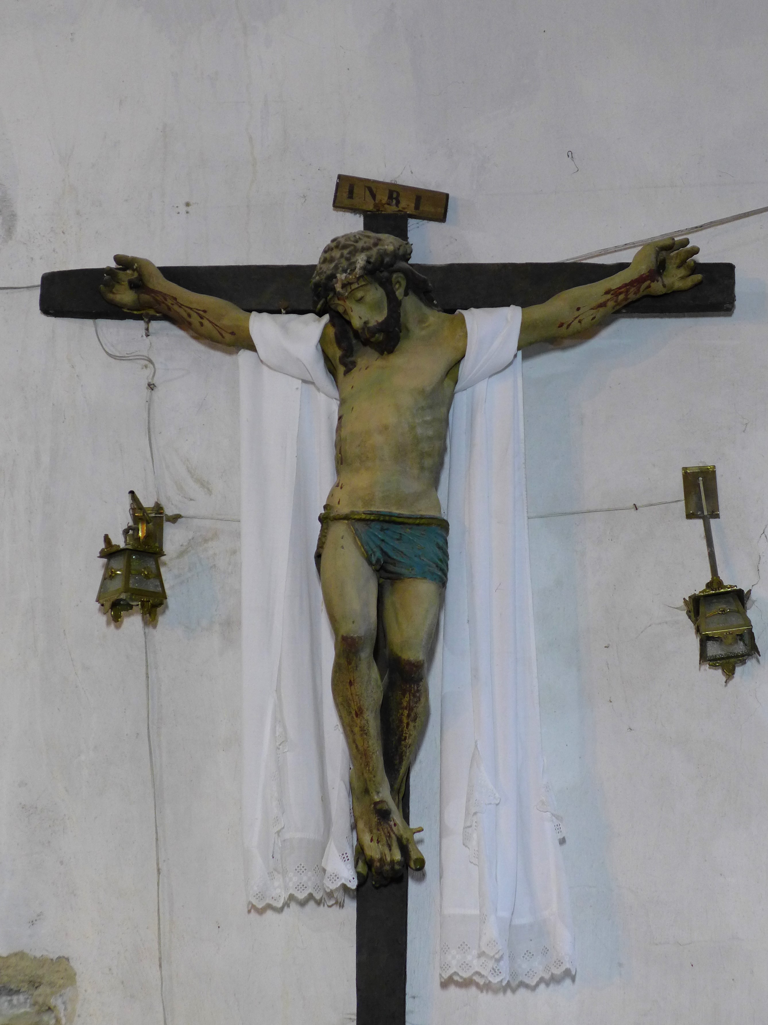 Crucificado de tamaño menor al natural anclado sobre cruz de largo vástago que hace pensar en una hipotética función procesional. La imagen va sujeta al madero mediante tres clavos. Muestra una anatomía de estudio bastante sumario, aunque con las costillas y pectorales marcados. La cabeza cae hacia el hombro derecho y su barba se clava sobre la zona del esternón. La barba se trabaja en pequeños mechones y el cabello muestra largas guedejas, que caen por detrás de los hombros, salvo una ondulada, visible sobre el hombro derecho. Dada lo grueso de su repinte la zona de la corona y la parte superior de la cabeza se encuentran bastante embotadas, dando la apariencia de un grueso casquete. Su magra anatomía se aprecia también en el demacrado rostro, de pómulos marcados y ojos rehundidos. Por último, el paño de pureza es corto, lleno de plegados finos y sujeto mediante un ceñidor atado en la cadera derecha.