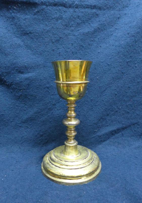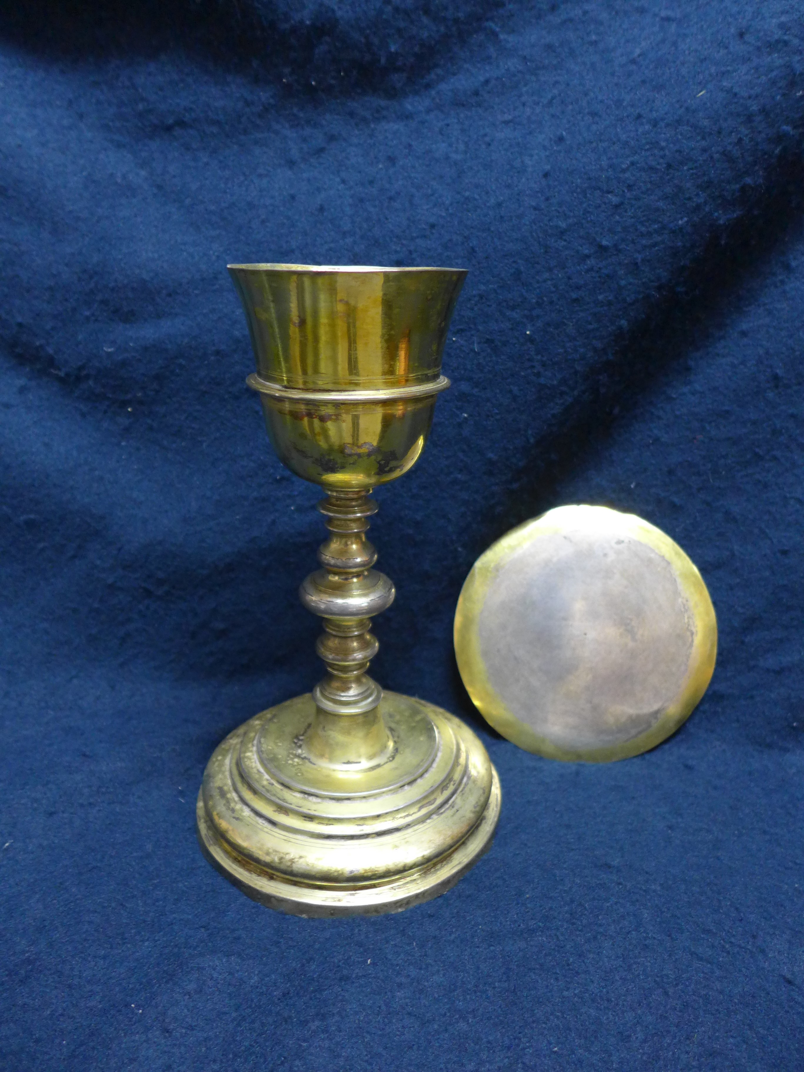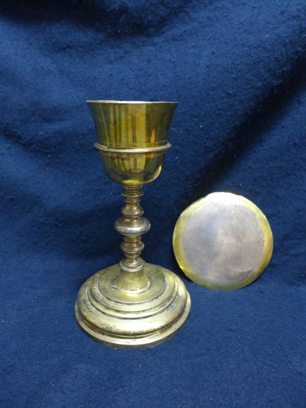 Base profusamente moldurada, con escalones en tamaño decreciente, borde saliente y remate troncocónico. El astil, torneado, y de apariencia simétrica remata en una copa acampanada de labios abiertos y resalte con listel en el centro de la misma. Conserva patena lisa a juego