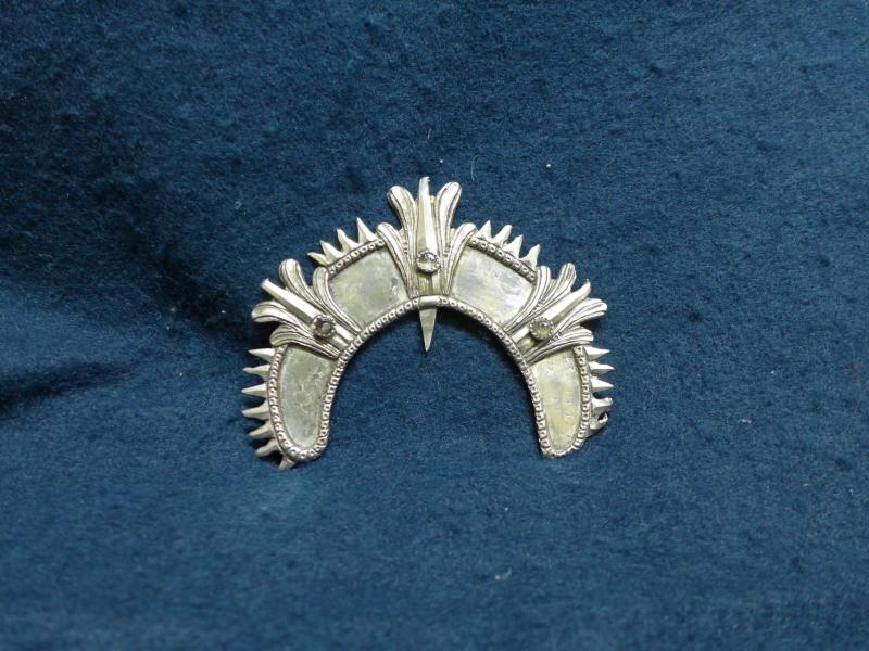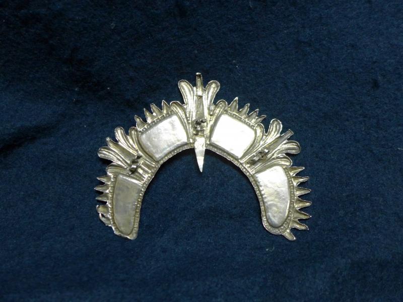 Plancha de plata guarnecida por un cordón de cuentas cuadrangulares. De su borde superior nace un resplandor de cortos rayos flameados y tres potencias que combinan hojas vegetales y rayos rectos. En el frente de estos últimos se engarzaron piedras circulares transparentes.