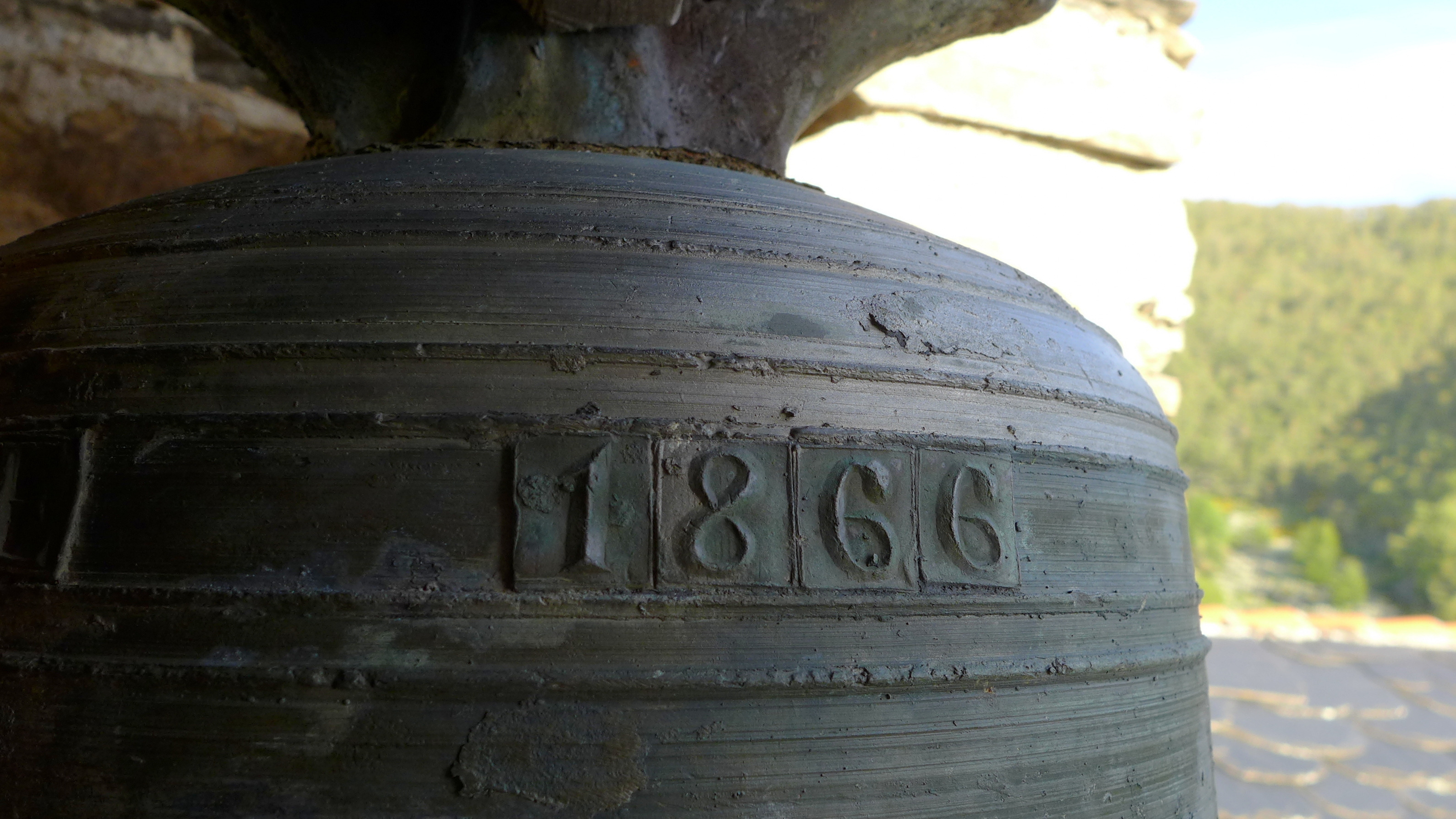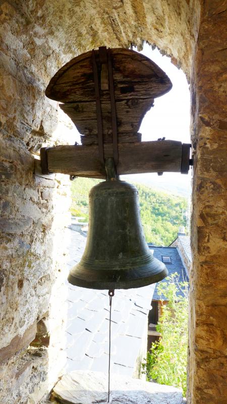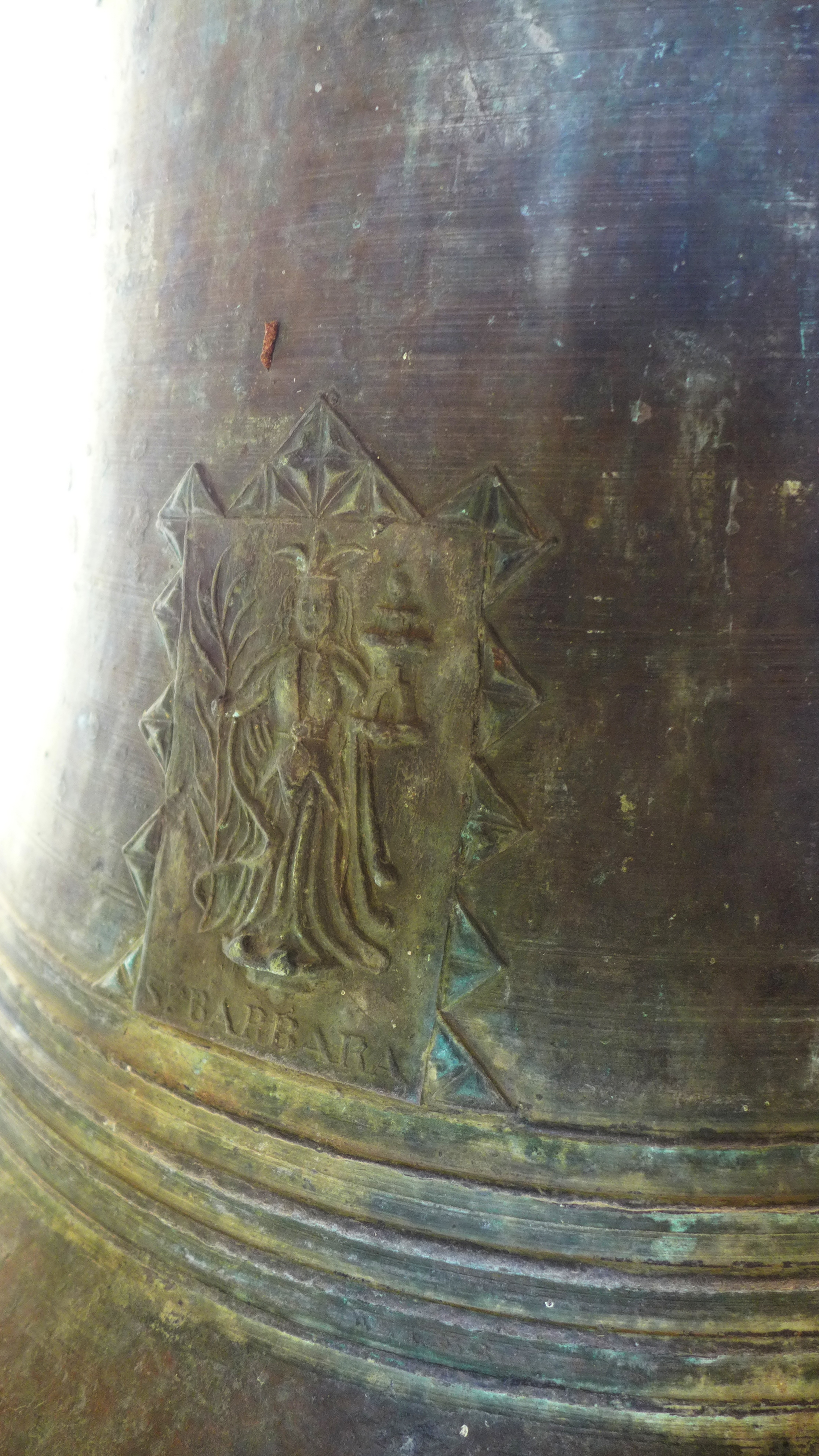 Campana de perfil esquilonado. Su tercio contiene una inscripción enmarcada entre dos parejas de cordones. Su medio, liso, tan solo se adorna con un relieve de Santa Bárbara que sostiene una palma en una mano y una torre en otro. Se inscribe en un cuadrado cuyo perímetro se exorna con moldes triangulares . Su pie consiste en cuadro cordones.