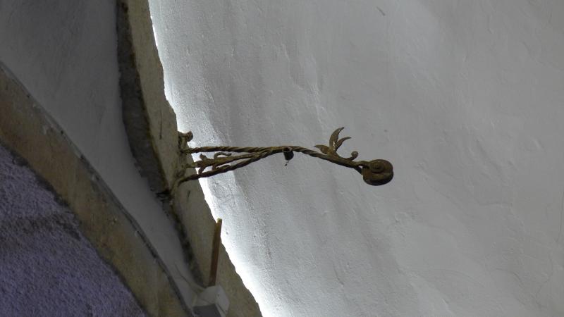 Pescante de obra de forja, muy sencillo, compuesto de dos barras de hierro torsas con las que se ancla al muro, que se funden en una para sostener la garrucha.