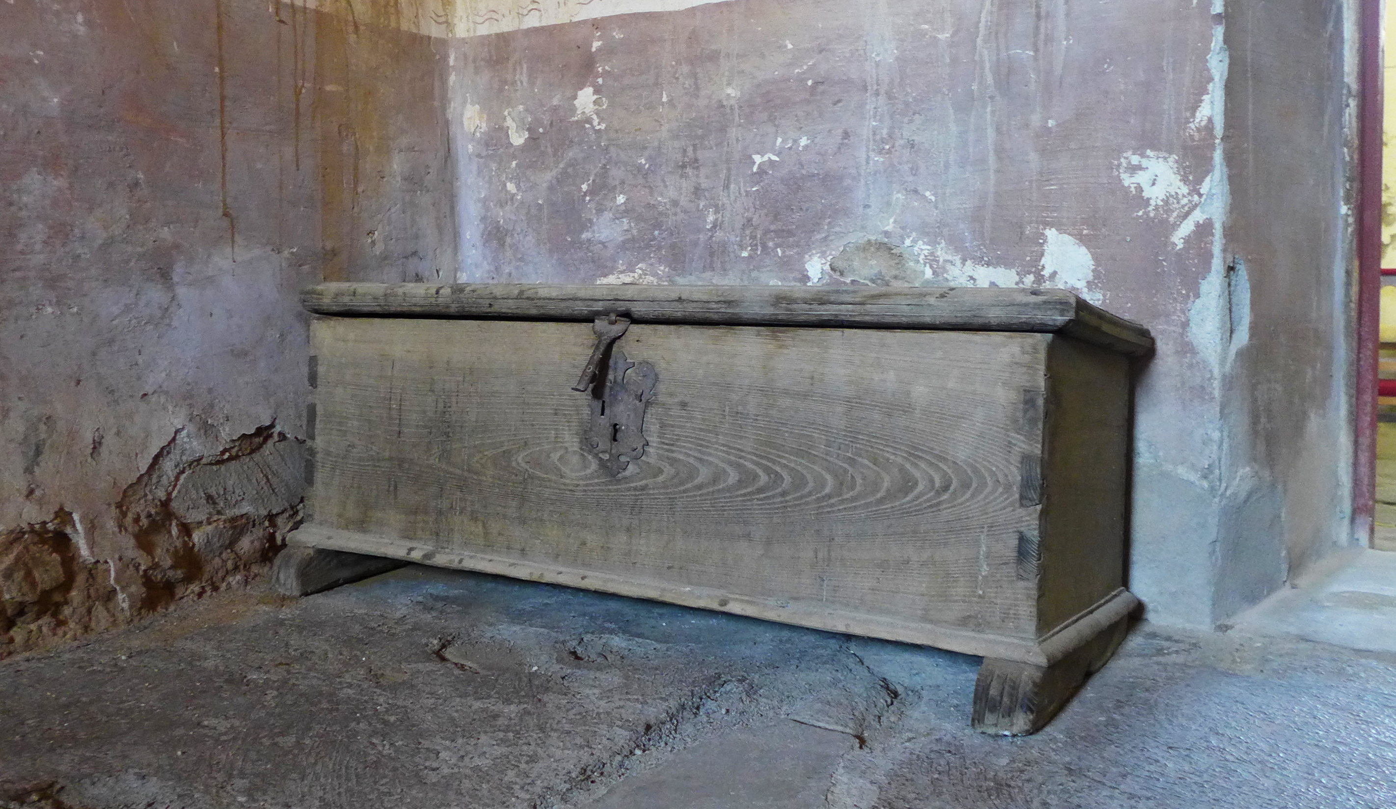 Caja de estructura prismática rectangular constituida por seis paneles enterizos, ensamblados los verticales a cola de milano, sobre dos pies. La cubierta es plana. Dispone de una cerrajas central en el panel frontal.