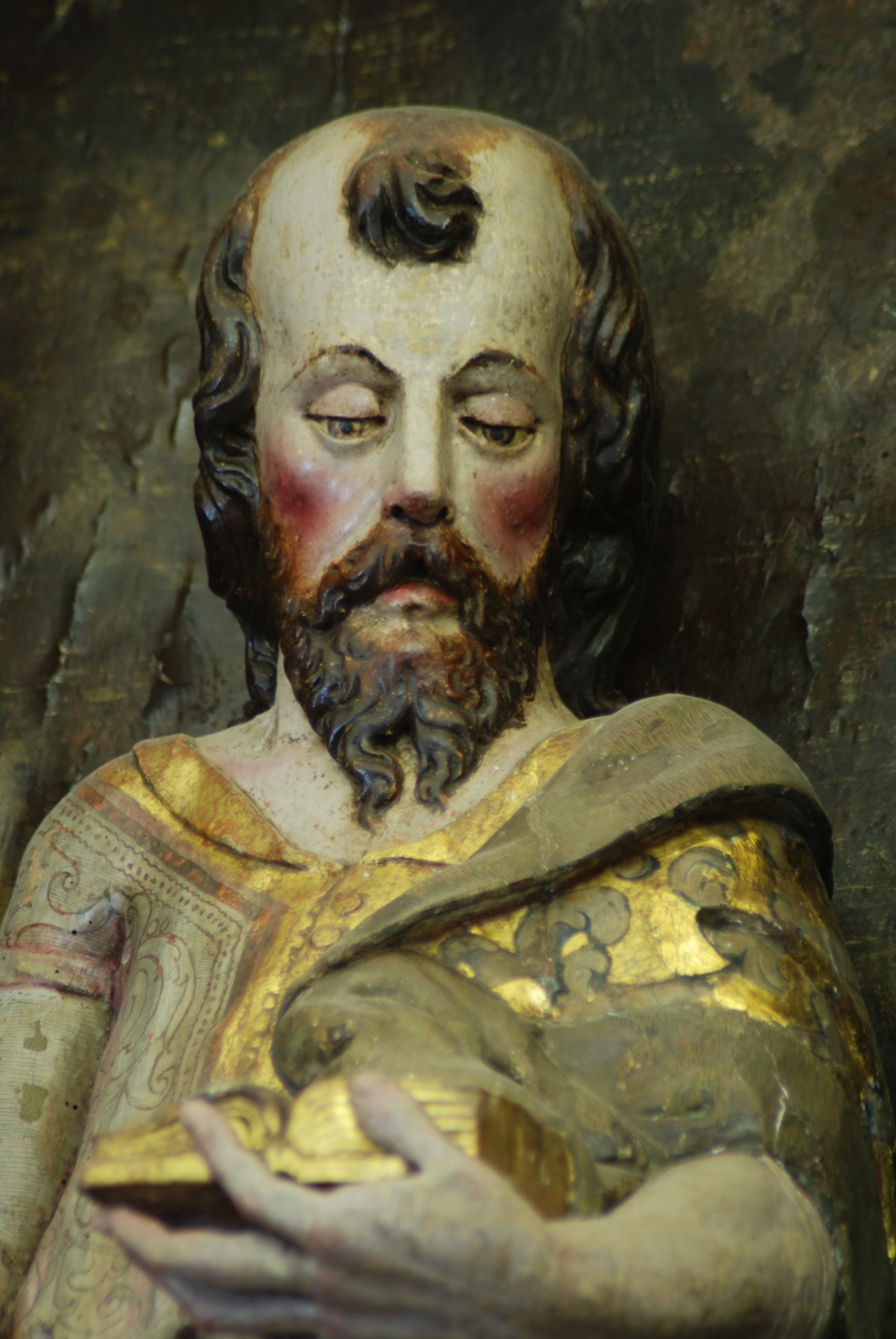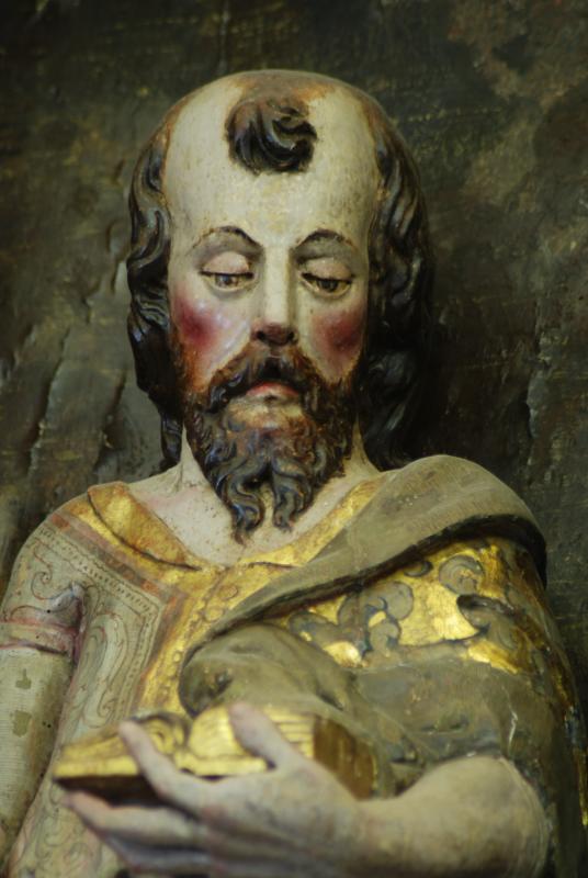 Su mano izquierda, en tensión, sostiene un libro abierto, y la contraria recoge un pliegue del manto. Asoma sus dos pies descalzos por debajo del mismo.