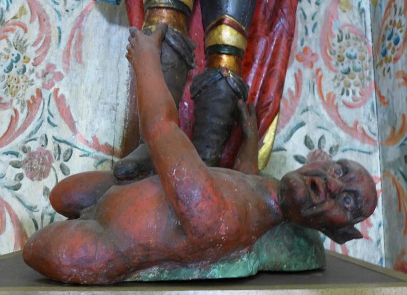 El ángel caído precisamente se sitúa a los pies del santo, que lo pisotea, identificado con todos los atributos de la fealdad. En este caso, un homúnculo de color rojo, cabeza de ojos desorbitados, enormes orejas y boca abierta, que se retuerce intentando sujetar con sus brazos las botas del arcángel.
