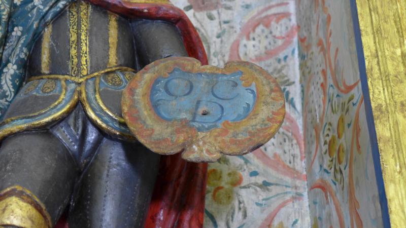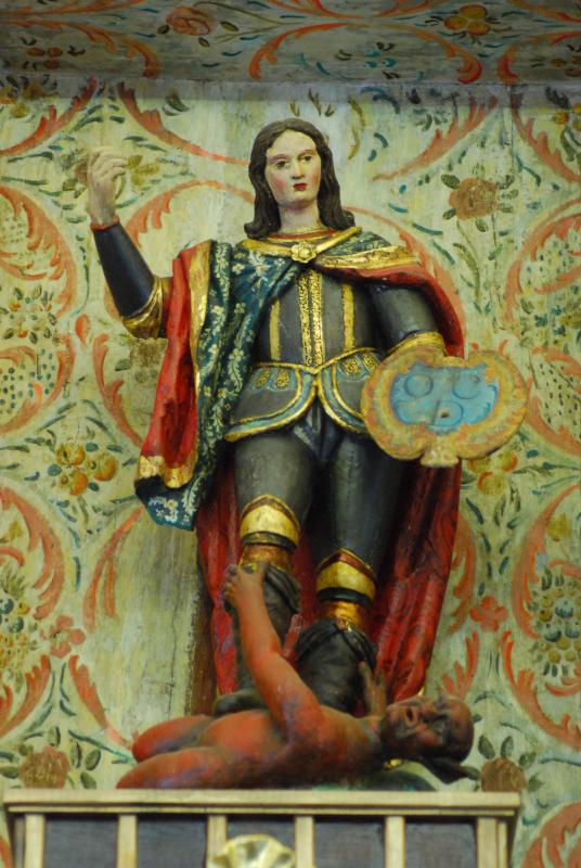El santo ha perdido el atributo de su mano derecha, que la tiene levantada (seguramente una lanza), pero conserva en la mano izquierda una tarja que enmarca entre laureles estilizados una inscripción: "qcD" (Quién como Dios), es decir, la traducción de su nombre hebreo y, según la tradición, el lema del arcángel en su lucha contra Lucifer.