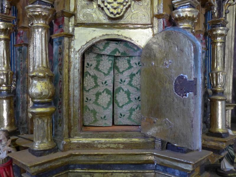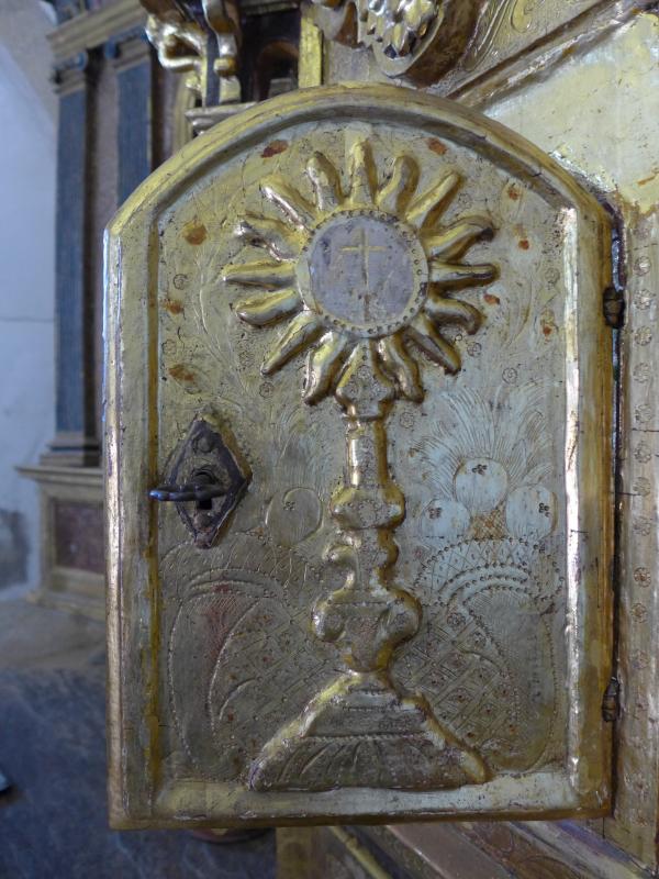 Portezuela dorada que conserva la cerraja. Sobre un fondo con decoración floral y geométrica incisa, se representa una custodia en relieve, con viril radiado y una cruz representada en la hostia exhibida.